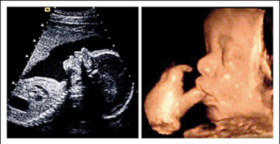 เปรียบเทียบอัลตร้าซาวด์ 2 มิติ และ 4 มิติ ( รูปซ้าย อัลตร้าซาวด์ 2 มิติ / รูปขวา อัลตร้าซาวด์ 4 มิติ )