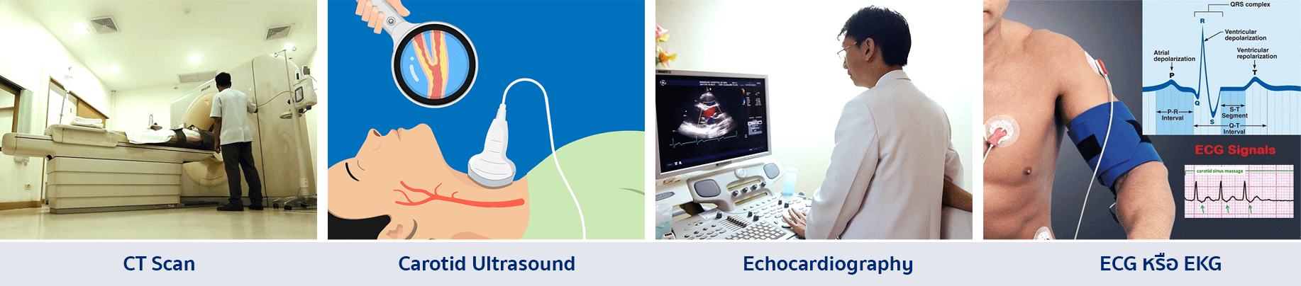 • การตรวจหลอดเลือดใหญ่ที่คอด้วยคลื่นเสียงความถี่สูง (Carotid Ultrasound) เพื่อตรวจดูการไหลเวียนของเลือดที่ไปเลี้ยงสมอง และตรวจดูคราบไขมันหรือพลัคที่เกาะอยู่ภายในหลอดเลือด