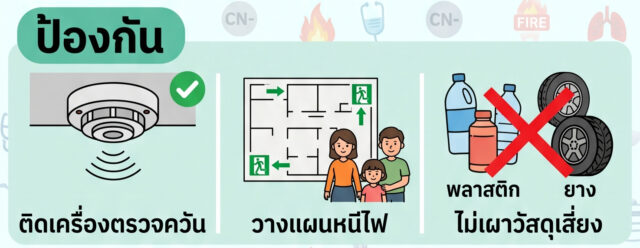 - ไฟไหม้ไม่ได้อันตรายแค่ “ไฟ” แต่ “ควันพิษ” โดยเฉพาะไซยาไนด์ อันตรายมาก