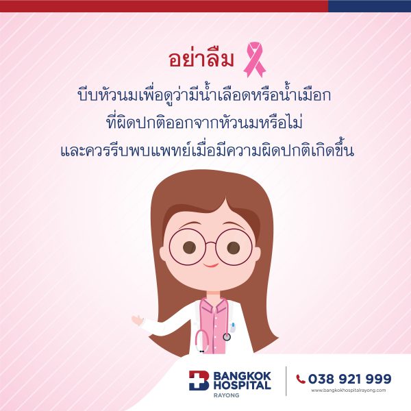 - อย่าลืม บีบหัวนมเพื่อดูว่ามีน้ำเลือด หรือน้ำเมือกที่ผิดปกติออกจากหัวนมหรือไม่และควรรีบพบแพทย์เมื่อมีความผิดปกติเกิดขึ้น
