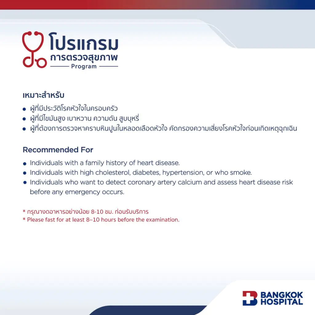 - ผู้ที่ต้องการตรวจหาคราบหินปูนในหลอดเลือดหัวใจ คัดกรองความเสี่ยงโรคหัวใจ ก่อนเกิดเหตุฉุกเฉิน