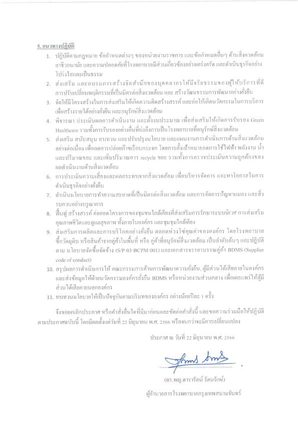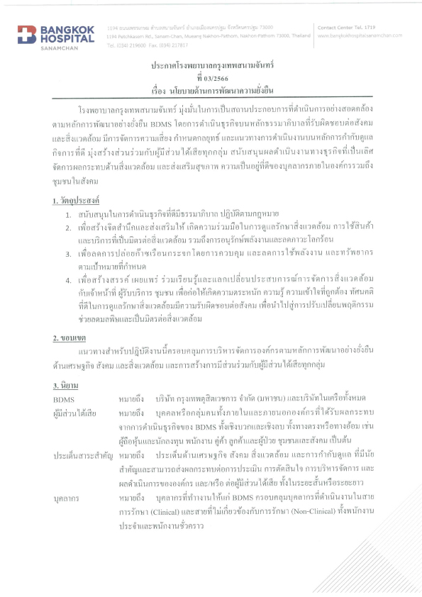 โรงพยาบาลกรุงเทพสนามจันทร์ มุ่งมั่นในการเป็นสถานประกอบการที่ดำเนินการอย่างสอดคล้อง ตามหลักการพัฒนาอย่างยั่งยืน BDMS โดยการดำเนินธุรกิจบนหลักธรรมาภิบาลที่รับผิดชอบต่อสังคม และสิ่งแวดล้อม มีการจัดการความเสี่ยง กำหนดกลยุทธ์ และแนวทางการดำเนินงานบนหลักการกำกับดูแลกิจการที่ดี มุ่งสร้างส่วนร่วมผุ้มีส่วนได้เสียทุกกลุ่ม สนับสนุนผลดำเนินงานทางธุรกิจที่เป็นเลิศ จัดการผกระทบด้านสิ่งแวดล้อม และ ส่งเสริมสุขภาพ ความเป็นอยู่ที่ดีของบุคลากรภายในองค์กรร่วมถึงชุมชนในสังคม