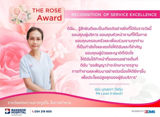 รางวัล ROSE ซึ่งย่อมาจาก Recognition for Outstanding Service Excellence เป็นรางวัลที่มอบเพื่อเชิดชูและเฉลิมฉลองให้กับพนักงานที่ไม่ใช่พยาบาล ที่แสดงถึงความทุ่มเท ความเมตตา และความมุ่งมั่นต่อความเป็นเลิศในด้านการบริการในการปฏิบัติหน้าที่และขับเคลื่อนเป้าหมายและพันธกิจของโรงพยาบาลกรุงเทพสนามจันทร์ ซึ่งเป็นแบบอย่างที่ยอดเยี่ยมในการให้บริการที่เป็นเลิศ