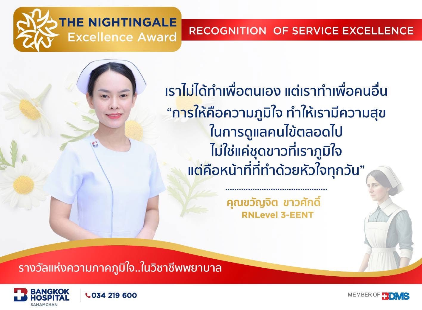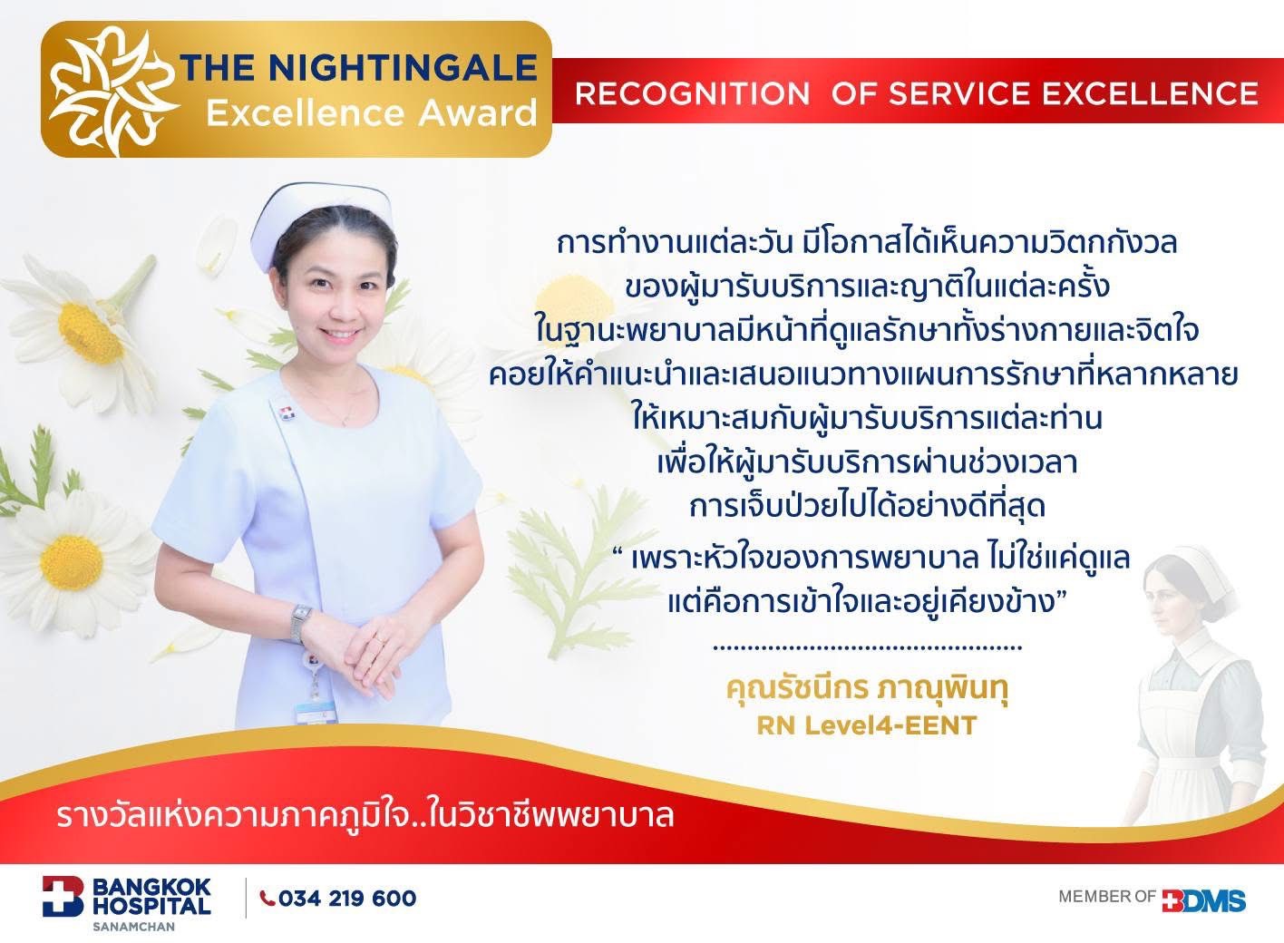 ฝ่ายการพยาบาล โรงพยาบาลกรุงเทพสนามจันทร์ ได้มอบรางวัล The Nightingale Excellence Award เพื่อสร้างแรงบันดาลใจ และเฟ้นหาพยาบาลคุณภาพผู้ทุ่มเทและอุทิศตนในการปฏิบัติหน้าที่อย่างสุดความสามารถ ในการดูแลเอาใจใส่ผู้ป่วย เพื่อเป็นแรงจูงใจให้กับพยาบาลในการตั้งใจดูแลผู้ป่วยและญาติอย่างเต็มที่