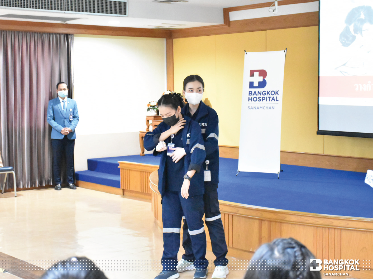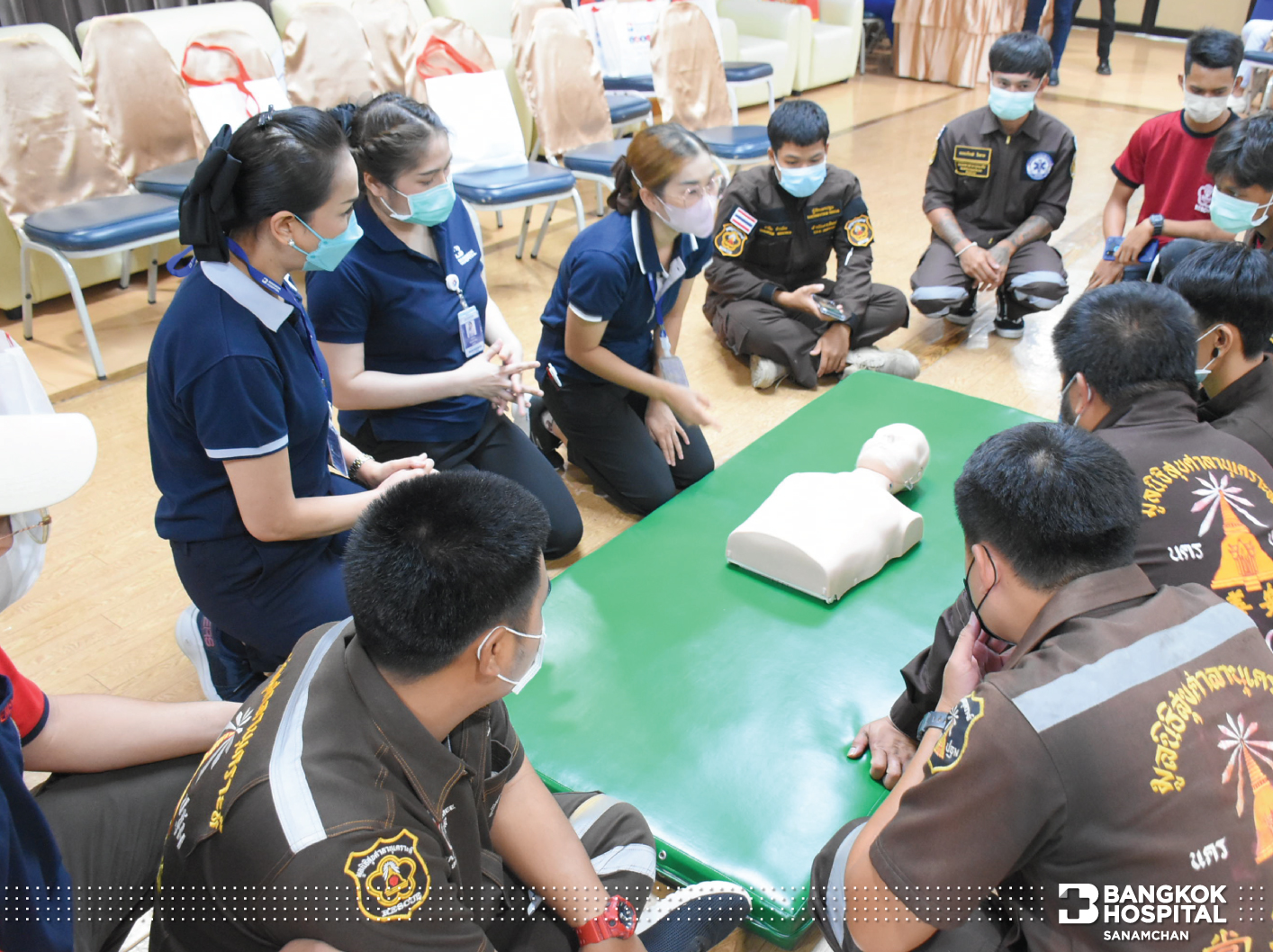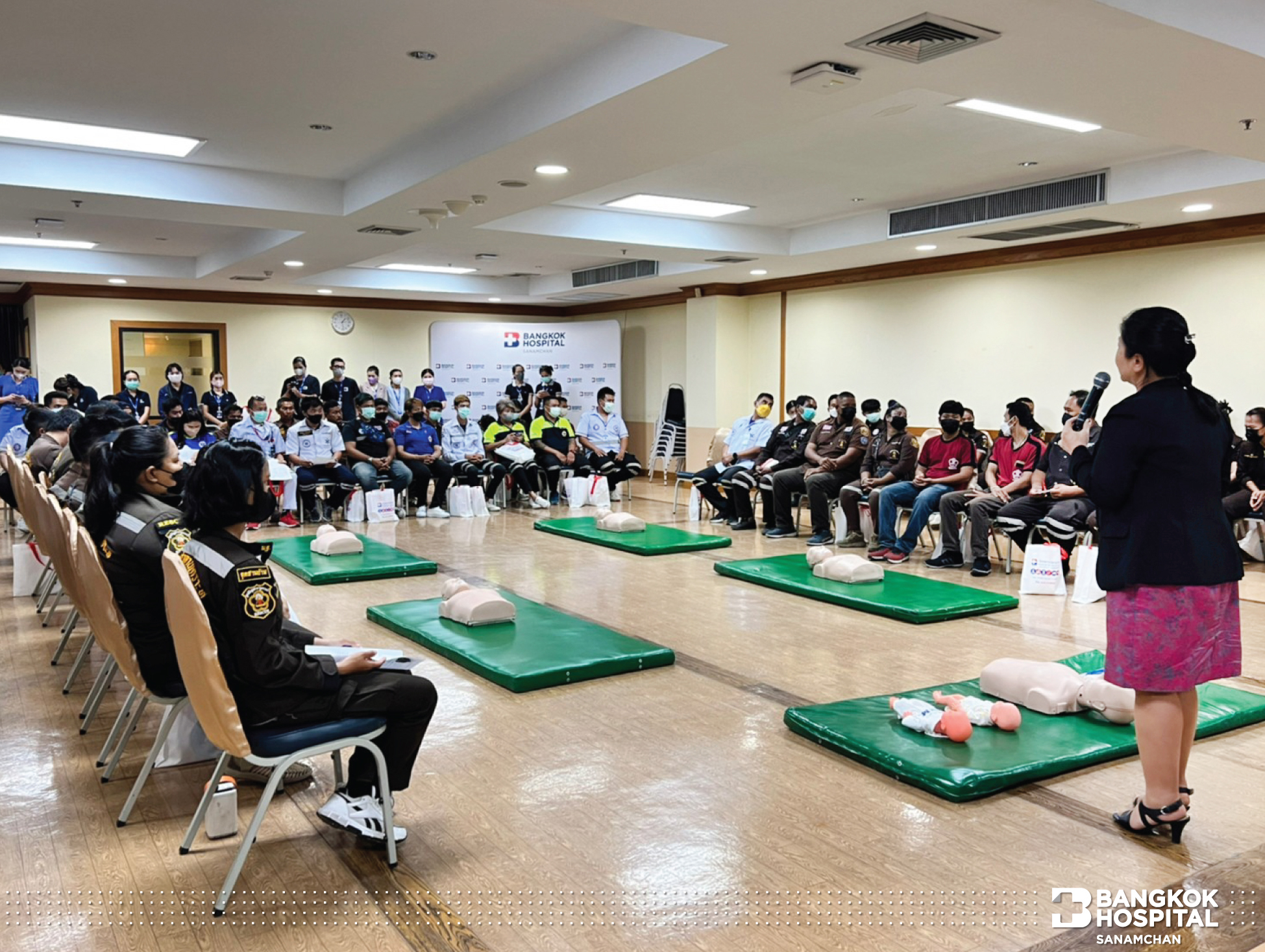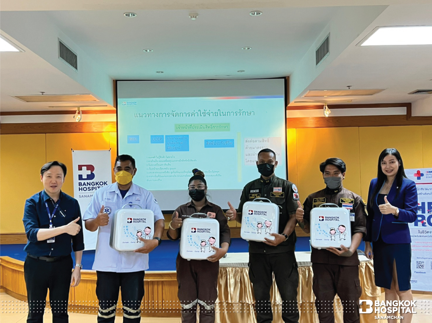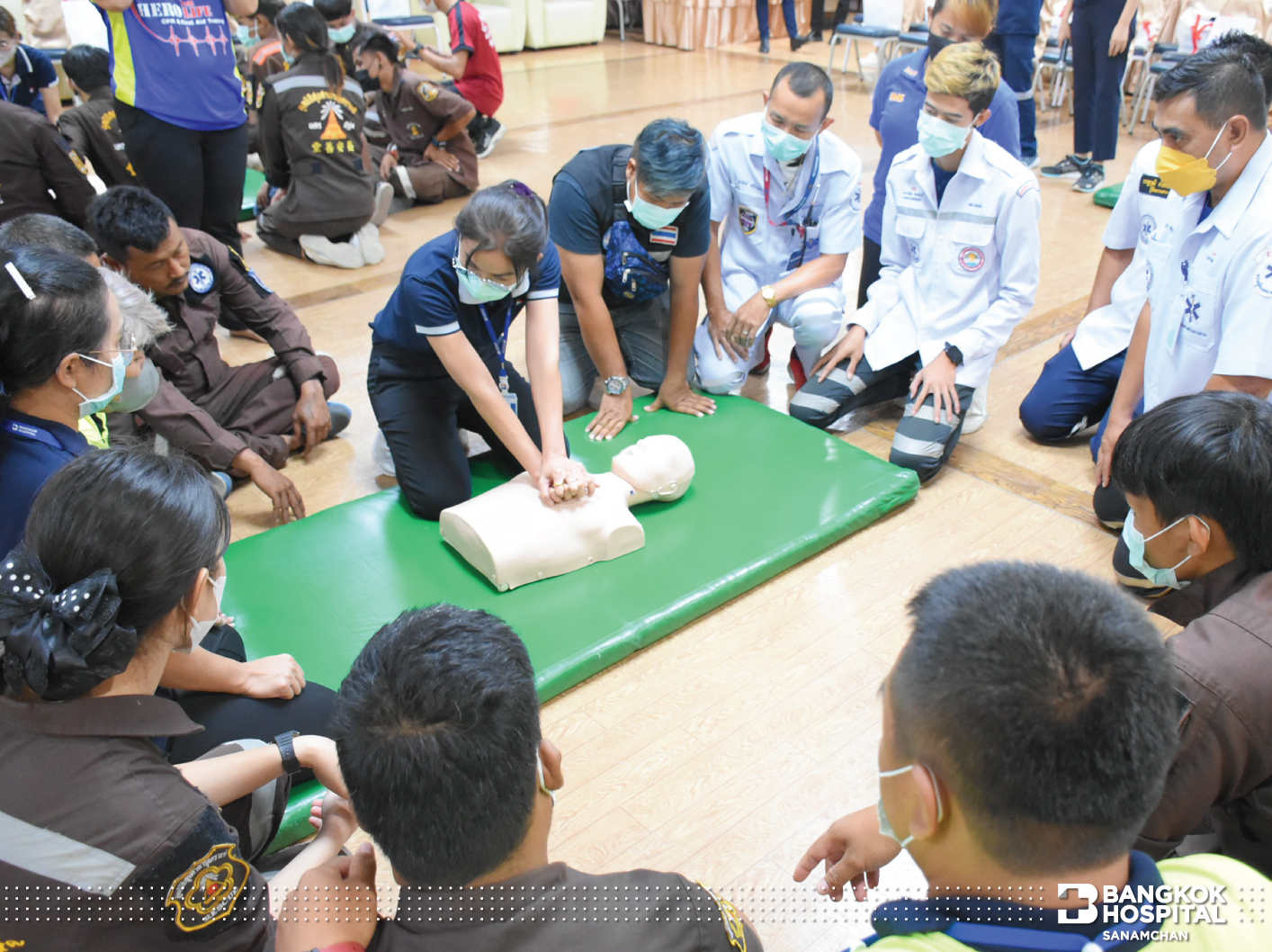 ดร.พญ.ดารารัตน์ รัตนรักษ์ ผู้อำนวยการโรงพยาบาลกรุงเทพสนามจันทร์ กล่าวเปิดกิจกรรม อบรมการปฎิบัติการช่วยชีวิตขั้นพื้นฐาน BLS (Basic Life Support) ให้กับ กลุ่มเจ้าหน้าที่มูลนิธิ และ เจ้าหน้าที่กู้ภัย รุ่นที่ 1 จำนวน 60 ท่าน ซึ่งการอบรมในครั้งนี้จัดขึ้นเพื่อให้เจ้าหน้ามูลนิธิ และ เจ้าหน้าที่กู้ภัย มีความพร้อมในการช่วยชีวิตขั้นพื้นฐาน (CPR) พร้อมช่วยเหลือผู้ป่วยที่อยู่ในภาวะฉุกเฉินเร่งด่วน และสามารถส่งต่อการรักษามายังโรงพยาบาลได้อย่างรวดเร็ว พร้อมทั้งวิธีการใช้งานเครื่องกระตุกหัวใจไฟฟ้า (AED) ที่ถูกวิธี ซึ่งการอบรมในครั้งนี้ ได้รับเกียรติจาก คุณพรชัย รัตนภากร ประธานมูลนิธิสุขศาลานุเคราะห์ เข้าพบทีมผู้บริหารเพื่อสร้างความร่วมมือในการช่วยเหลือสังคมในระยะยาวต่อไป