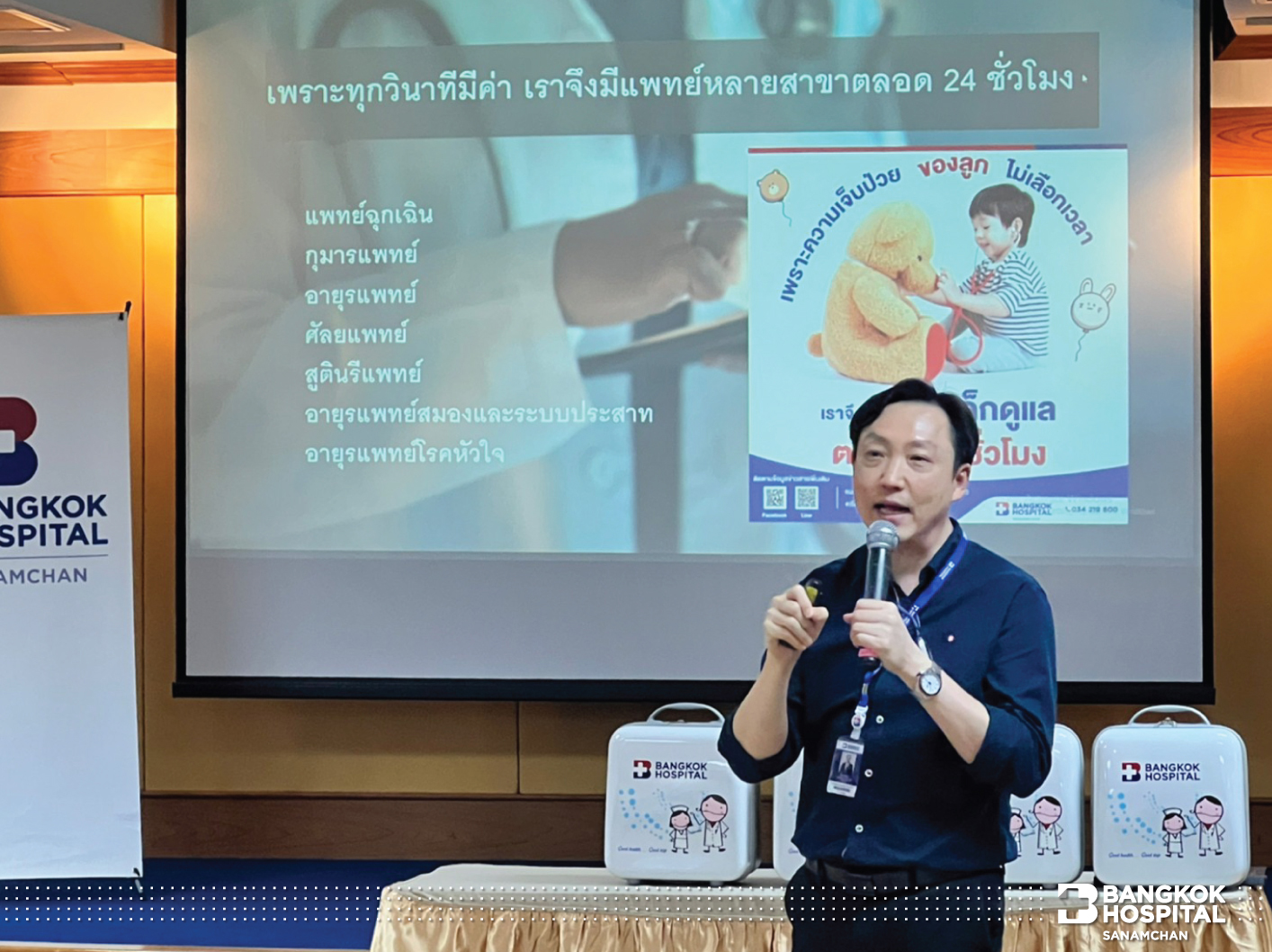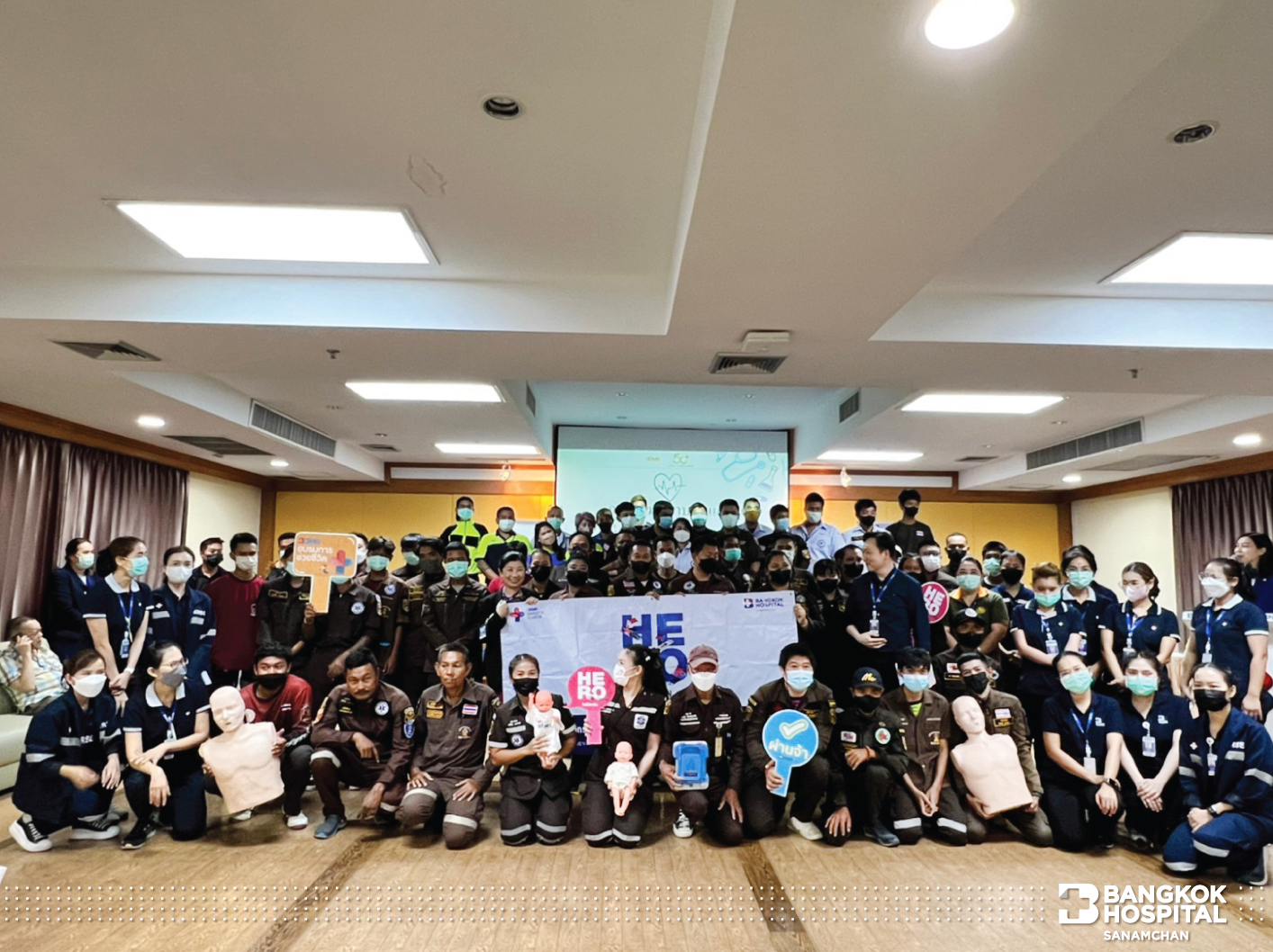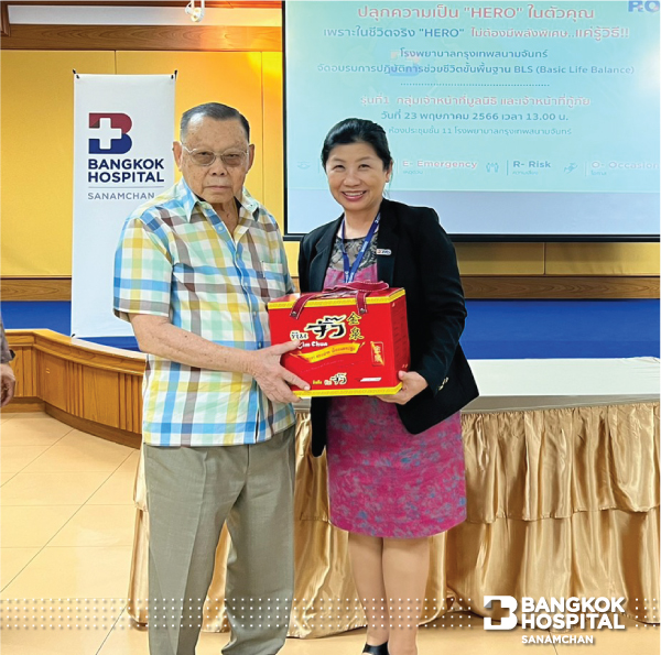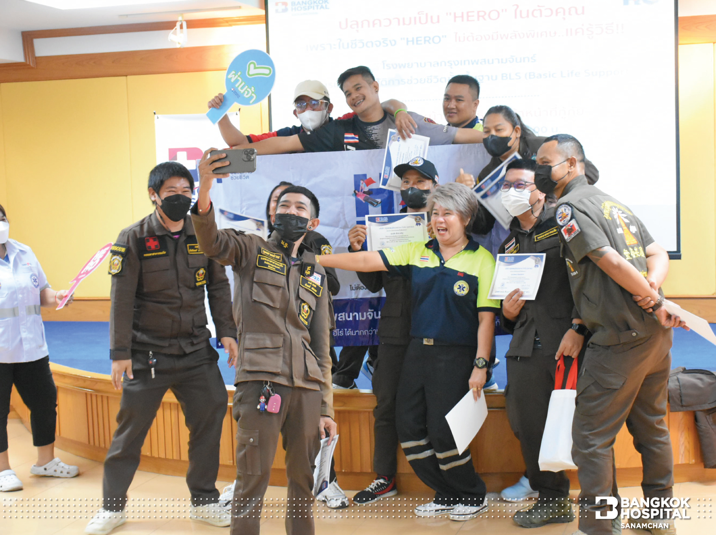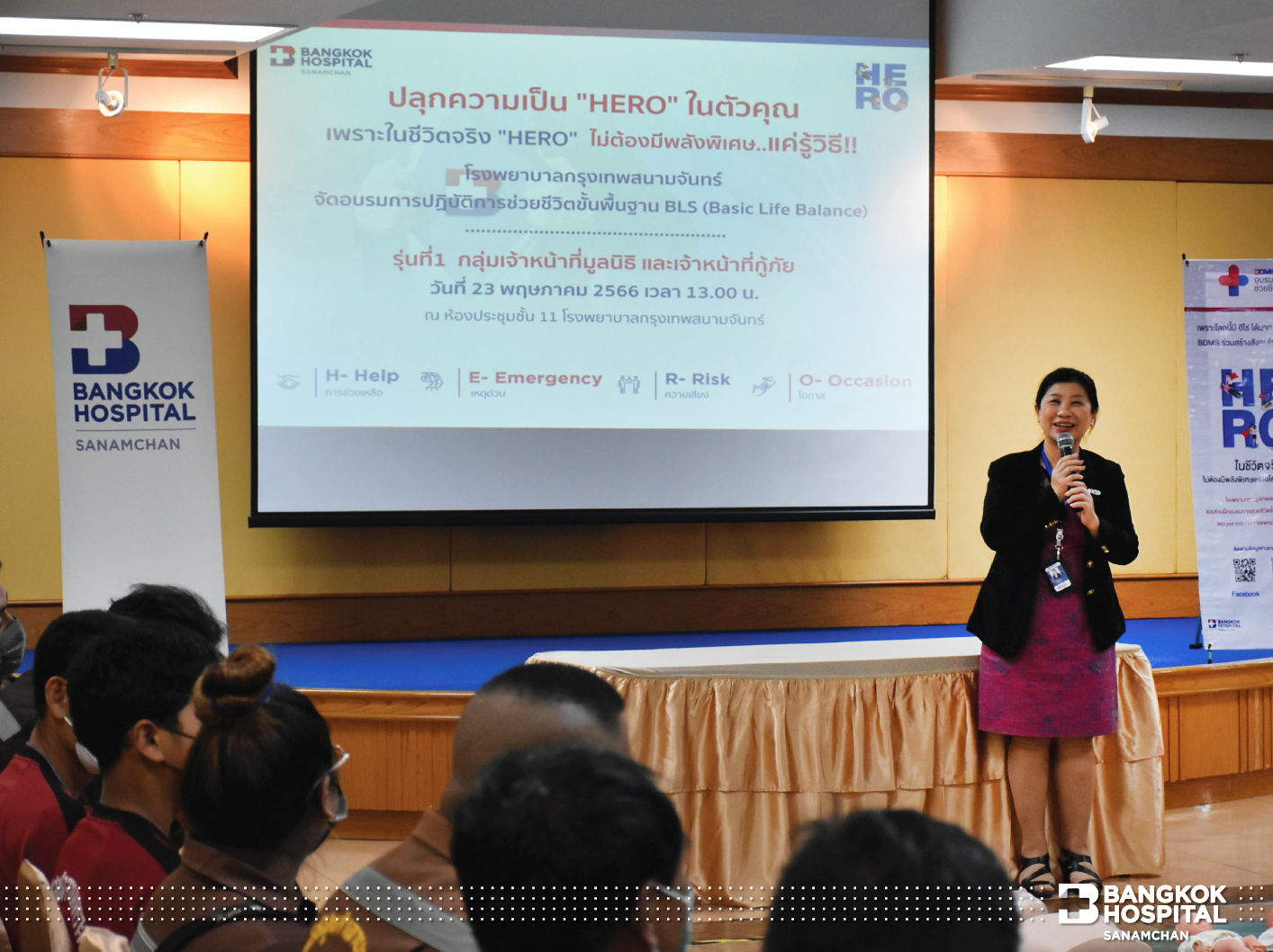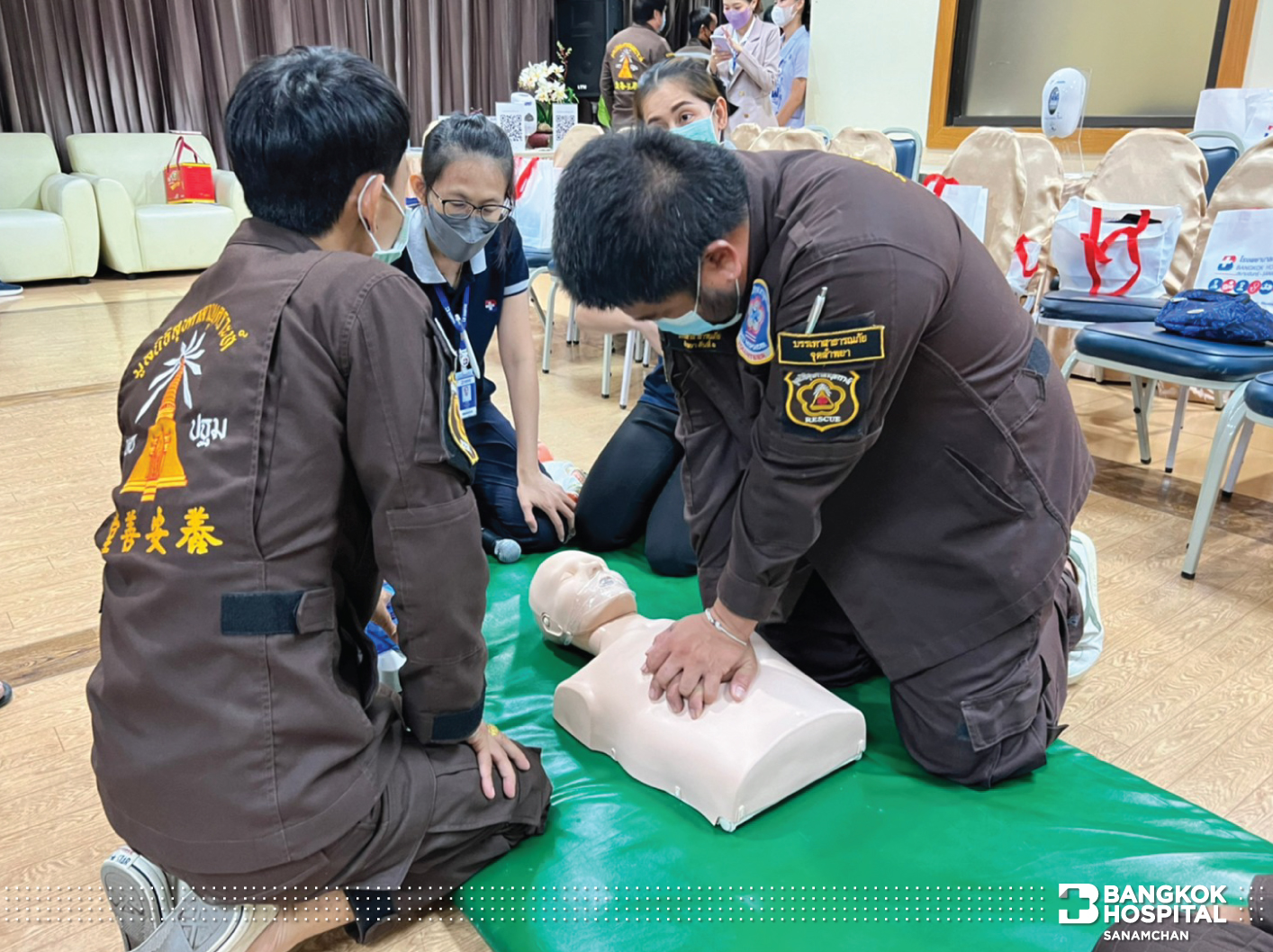 ดร.พญ.ดารารัตน์ รัตนรักษ์ ผู้อำนวยการโรงพยาบาลกรุงเทพสนามจันทร์ กล่าวเปิดกิจกรรม อบรมการปฎิบัติการช่วยชีวิตขั้นพื้นฐาน BLS (Basic Life Support) ให้กับ กลุ่มเจ้าหน้าที่มูลนิธิ และ เจ้าหน้าที่กู้ภัย รุ่นที่ 1 จำนวน 60 ท่าน ซึ่งการอบรมในครั้งนี้จัดขึ้นเพื่อให้เจ้าหน้ามูลนิธิ และ เจ้าหน้าที่กู้ภัย มีความพร้อมในการช่วยชีวิตขั้นพื้นฐาน (CPR) พร้อมช่วยเหลือผู้ป่วยที่อยู่ในภาวะฉุกเฉินเร่งด่วน และสามารถส่งต่อการรักษามายังโรงพยาบาลได้อย่างรวดเร็ว พร้อมทั้งวิธีการใช้งานเครื่องกระตุกหัวใจไฟฟ้า (AED) ที่ถูกวิธี ซึ่งการอบรมในครั้งนี้ ได้รับเกียรติจาก คุณพรชัย รัตนภากร ประธานมูลนิธิสุขศาลานุเคราะห์ เข้าพบทีมผู้บริหารเพื่อสร้างความร่วมมือในการช่วยเหลือสังคมในระยะยาวต่อไป