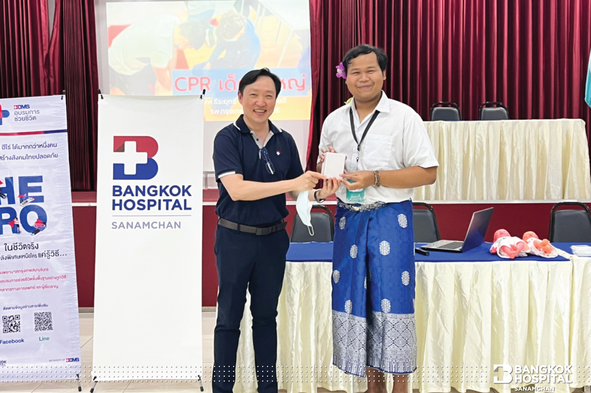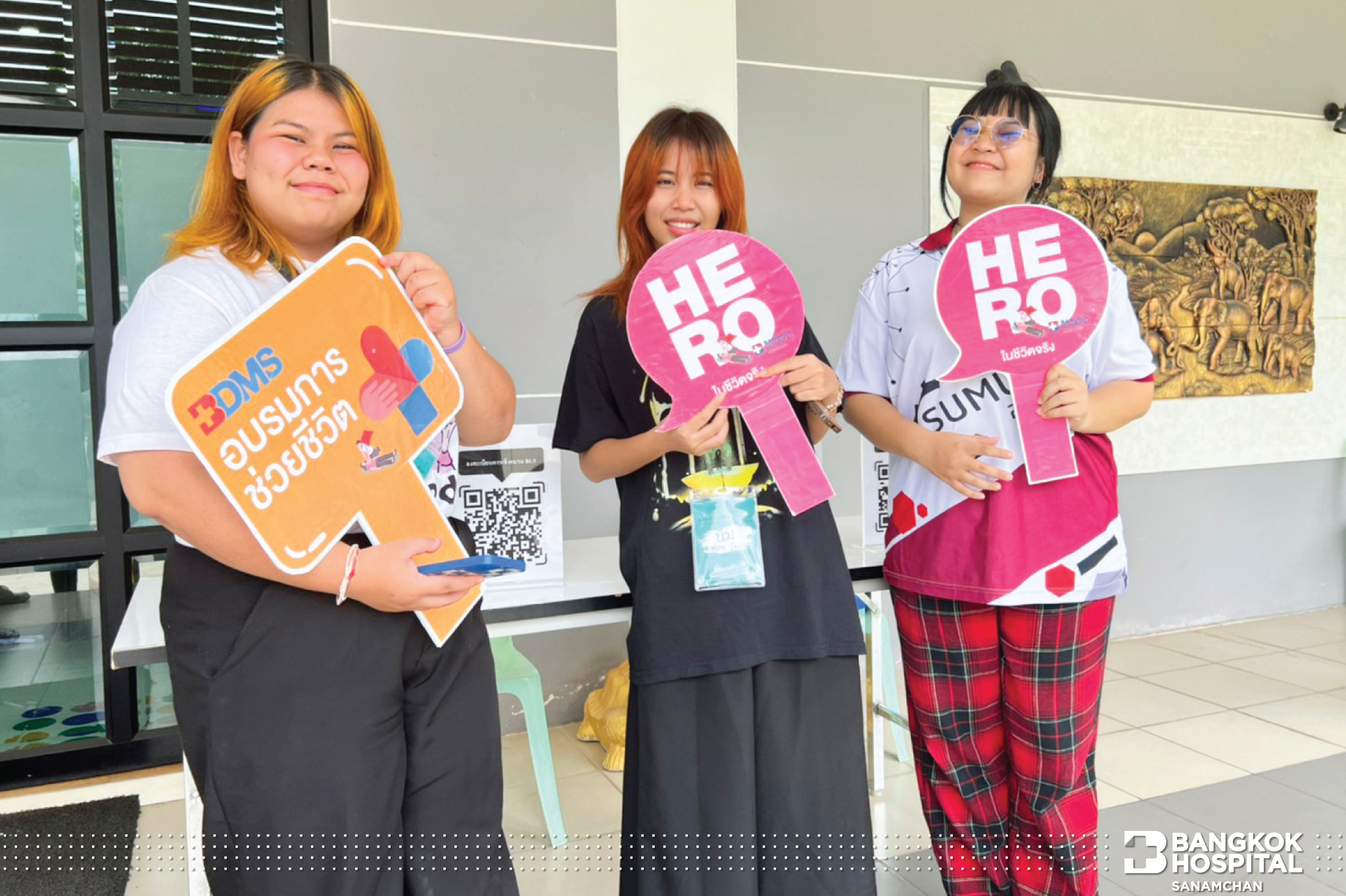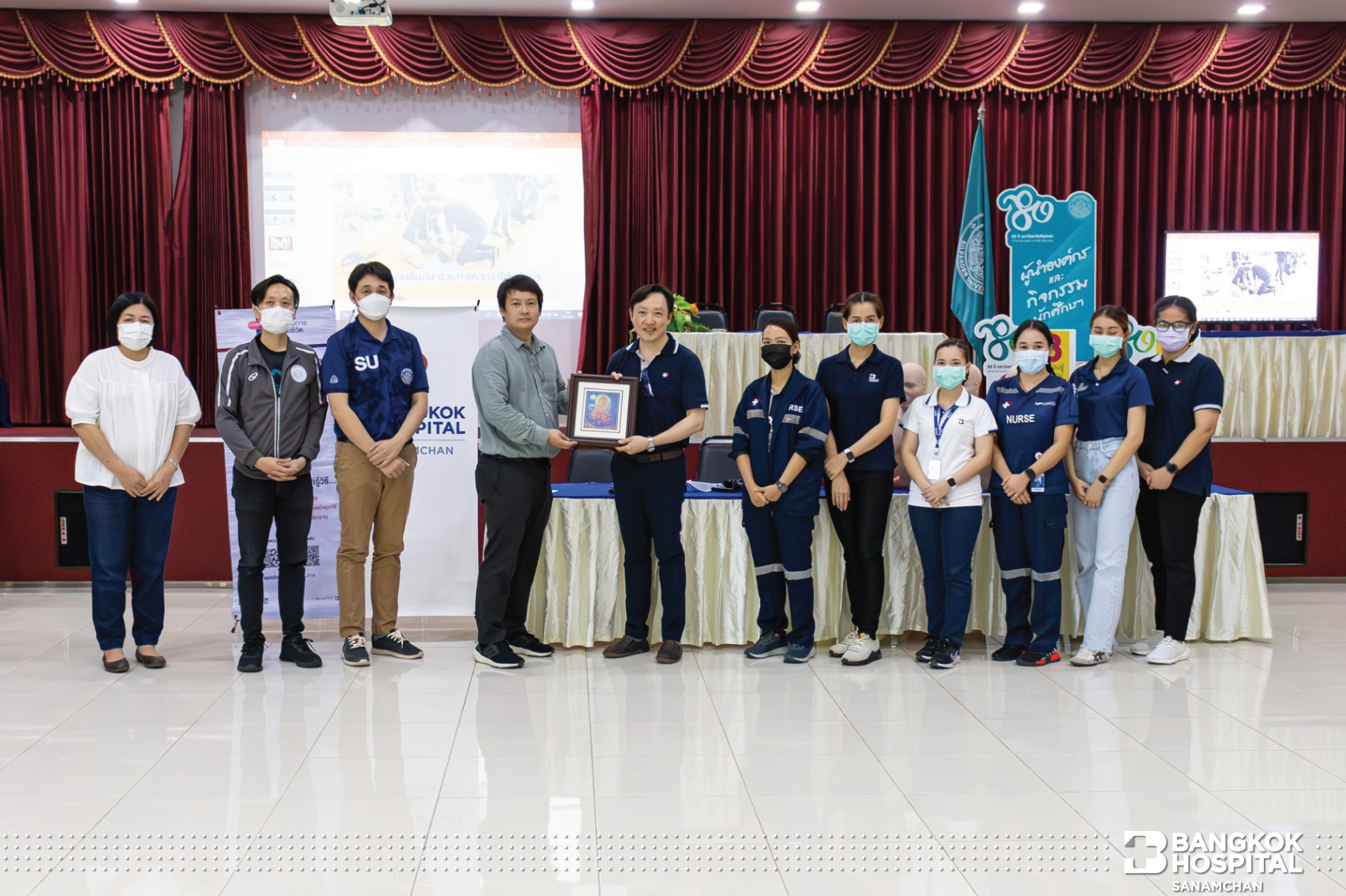 โรงพยาบาลกรุงเทพสนามจันทร์ นำโดย นายแพทย์ธีระยุทธ์ ธนนันทน์ธัญโชติ ผู้ช่วยผู้อำนวยการ พร้อมด้วยทีมงาน “ เพิ่มฮีโร่ สู่สังคม” ขอขอบคุณ ผู้ช่วยศาสตราจารย์ ดร.ณัฐวุฒิ ธาราวดี รองอธิการบดีฝ่ายกิจการนักศึกษา มหาวิทยาลัยศิลปากร พระราชวังสนามจันทร์ ที่ให้ทางโรงพยาบาลได้มาฝึกอบรม Basic Life Support การช่วยฟื้นคืนชีพเบื้องต้น พร้อมทั้ง Work Shop ภาคปฎิบัติ ให้น้องใหม่ของสโมสรนักศึกษา จำนวนทั้งสิ้น 76 ท่าน ณ คุ้มพญาซอรีสอร์ท จ.สมุทรสงคราม