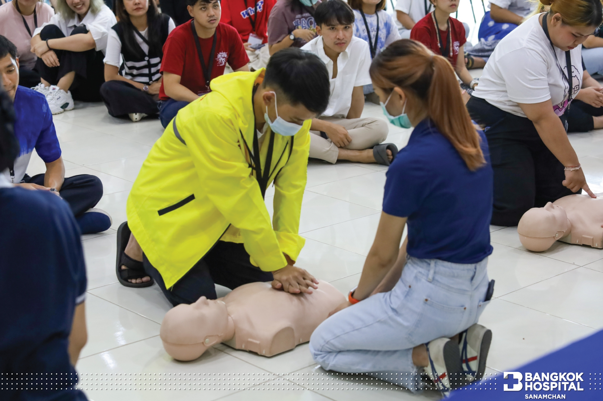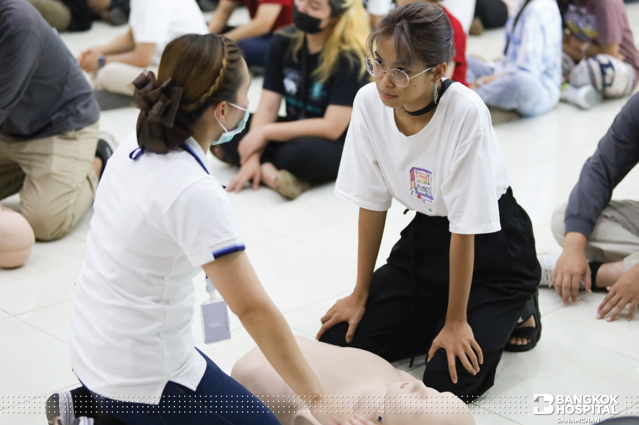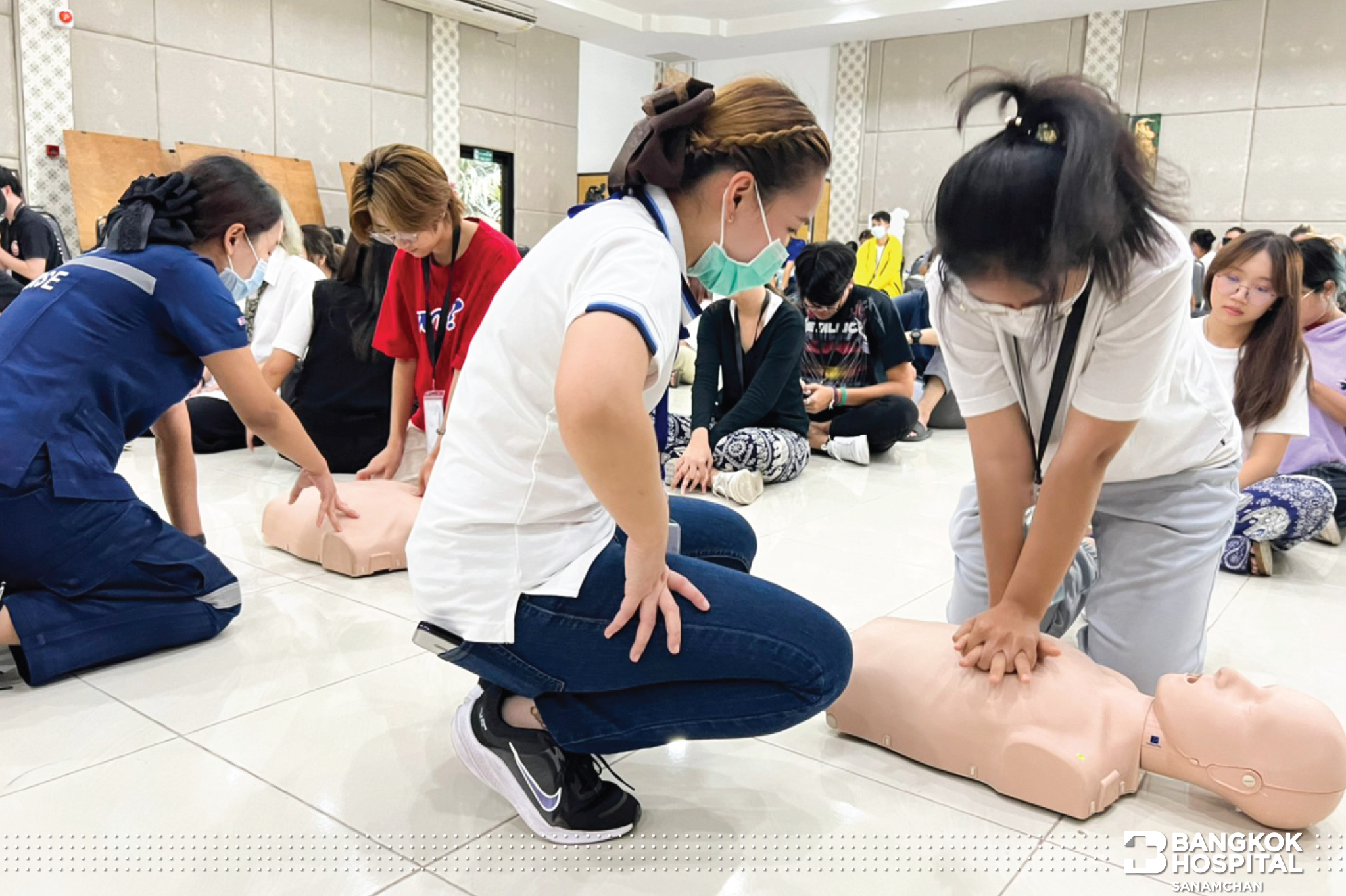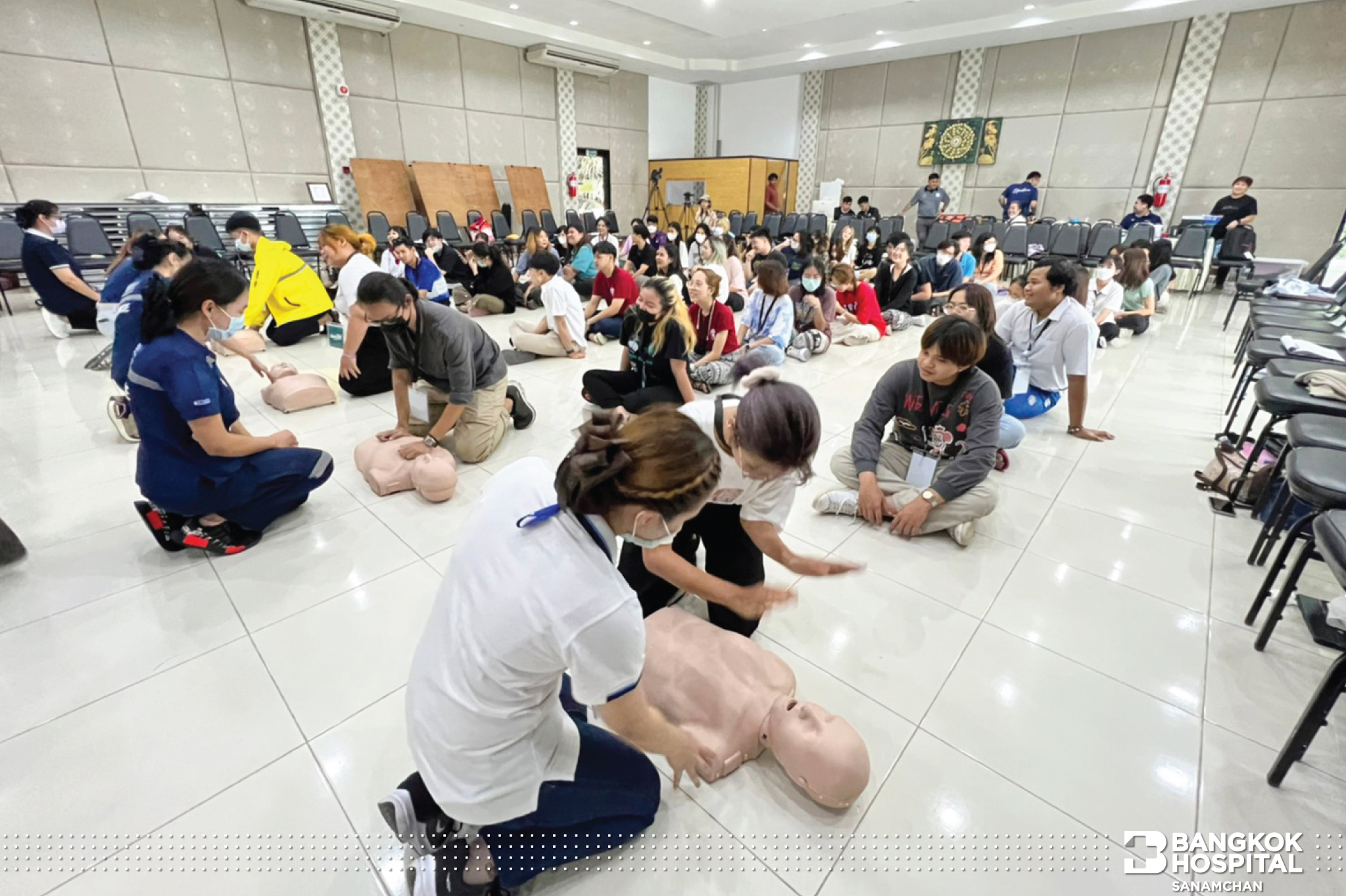 ซึ่งกิจกรรมในครั้งนี้ได้รับความสนใจจากน้องๆผู้เข้าร่วมอบรมเป็นอย่างมาก ได้รับความรู้ขั้นตอนการช่วยผู้ป่วยหัวใจหยุดเต้นเฉียบพลันอย่างถูกวิธี หลังจากได้รับความรู้ภาคทฤษฎีแล้ว ก็ยังได้ทดลองปฎิบัติการช่วยฟื้นคืนชีพ (CPR) ผ่านหุ่นการฝึกอบรมทุกคน โดยมีพี่ทีมงาน คอยสอนและให้คำแนะนำอย่างใกล้ชิด ทางโรงพยาบาลกรุงเทพสนามจันทร์ มีความมุ่งมั่นที่จะเพิ่มฮีโร่ สู่สังคม อย่างต่อเนื่อง เพราะนาทีวิกฤตรอไม่ได้ทุกคนเป็นฮีโร่ได้ แค่รู้วิธี ที่ถูกต้อง
