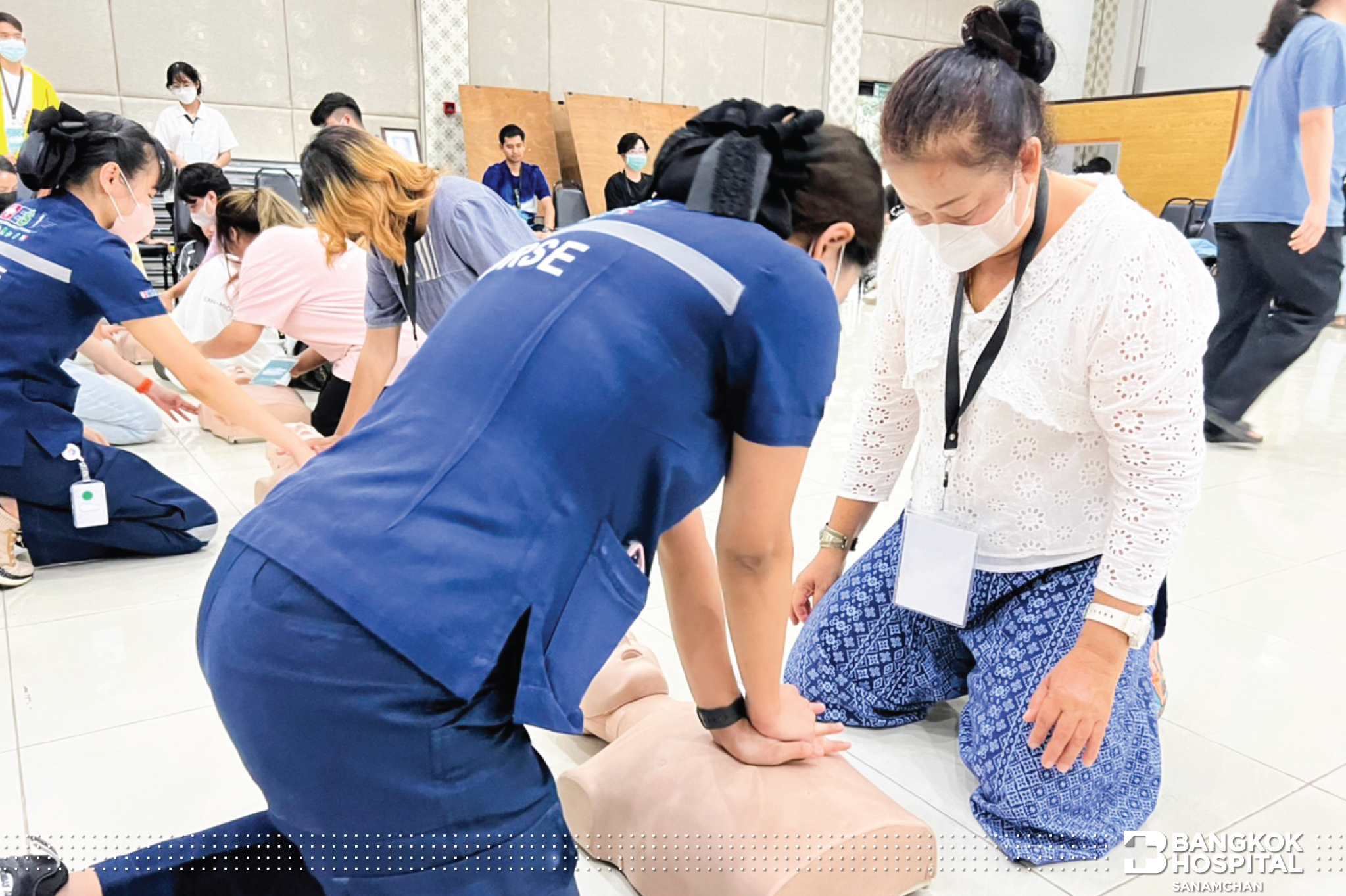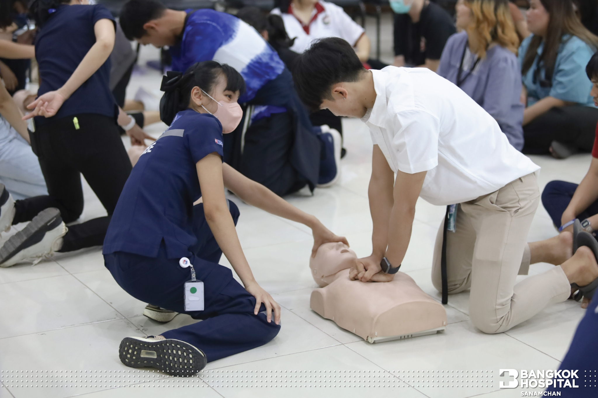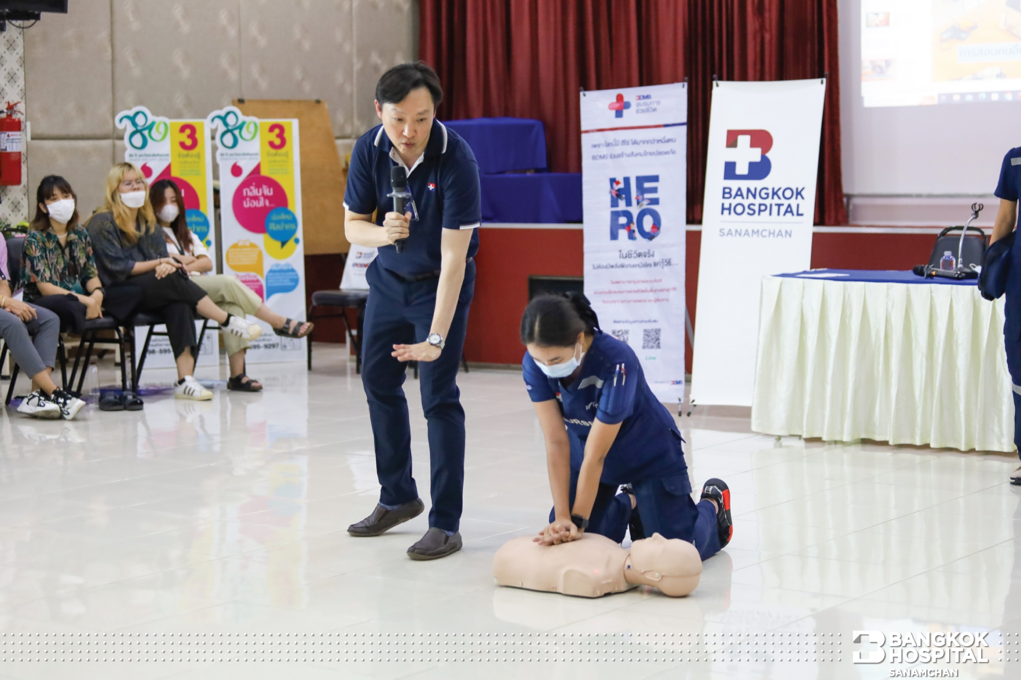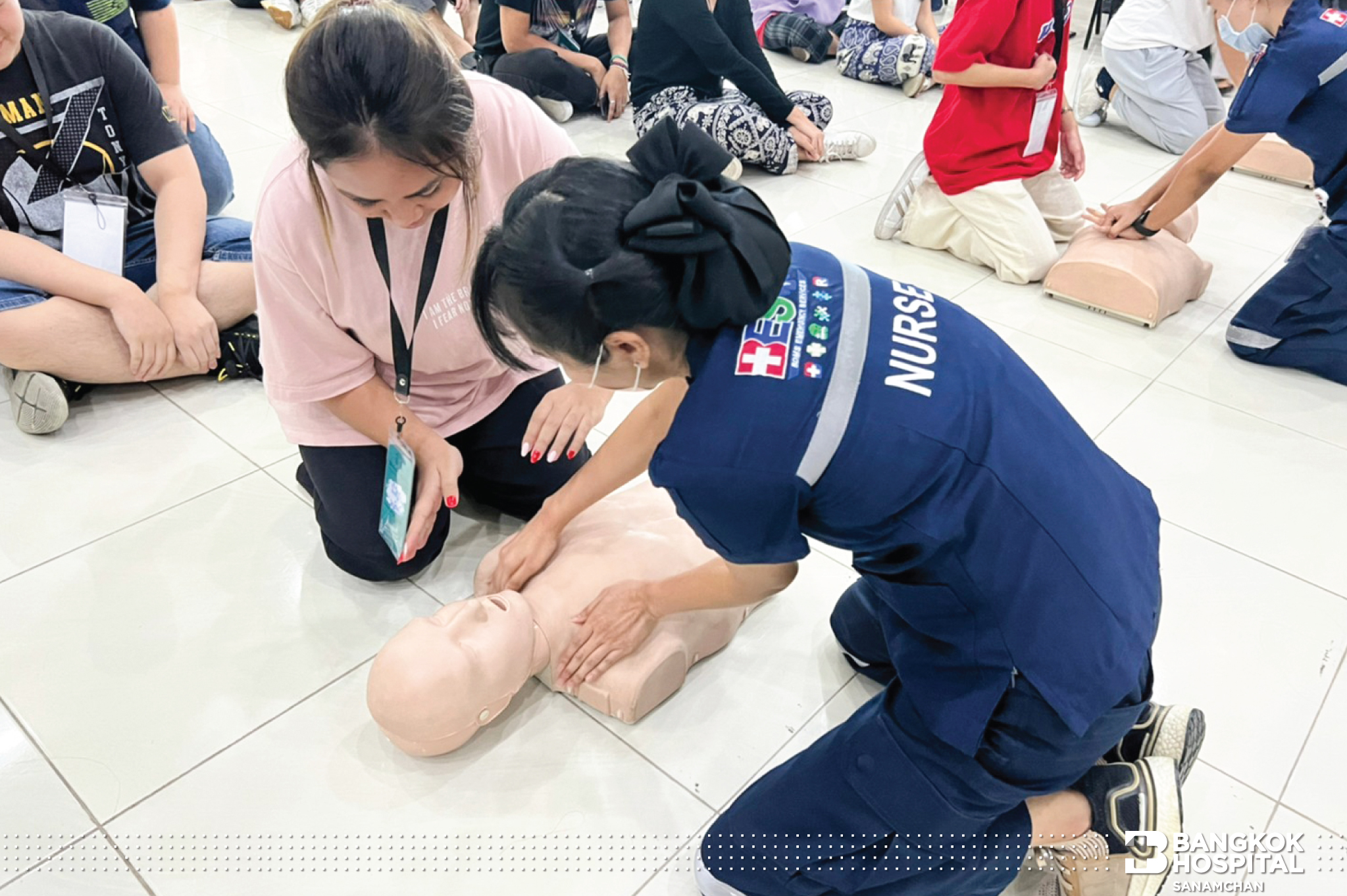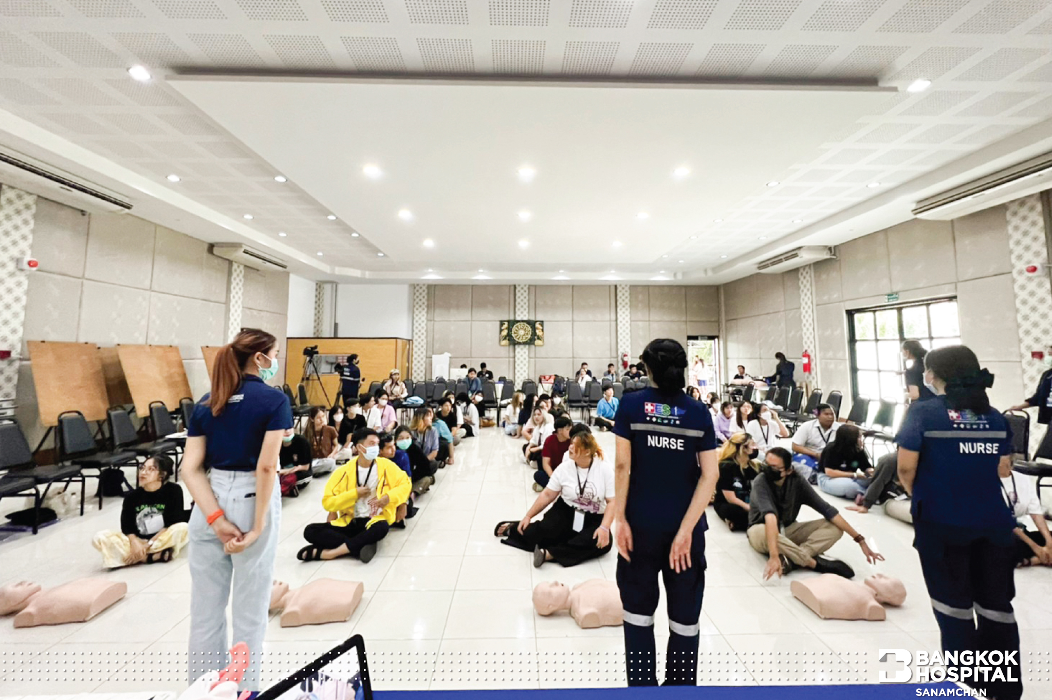 ซึ่งกิจกรรมในครั้งนี้ได้รับความสนใจจากน้องๆผู้เข้าร่วมอบรมเป็นอย่างมาก ได้รับความรู้ขั้นตอนการช่วยผู้ป่วยหัวใจหยุดเต้นเฉียบพลันอย่างถูกวิธี หลังจากได้รับความรู้ภาคทฤษฎีแล้ว ก็ยังได้ทดลองปฎิบัติการช่วยฟื้นคืนชีพ (CPR) ผ่านหุ่นการฝึกอบรมทุกคน โดยมีพี่ทีมงาน คอยสอนและให้คำแนะนำอย่างใกล้ชิด ทางโรงพยาบาลกรุงเทพสนามจันทร์ มีความมุ่งมั่นที่จะเพิ่มฮีโร่ สู่สังคม อย่างต่อเนื่อง เพราะนาทีวิกฤตรอไม่ได้ทุกคนเป็นฮีโร่ได้ แค่รู้วิธี ที่ถูกต้อง