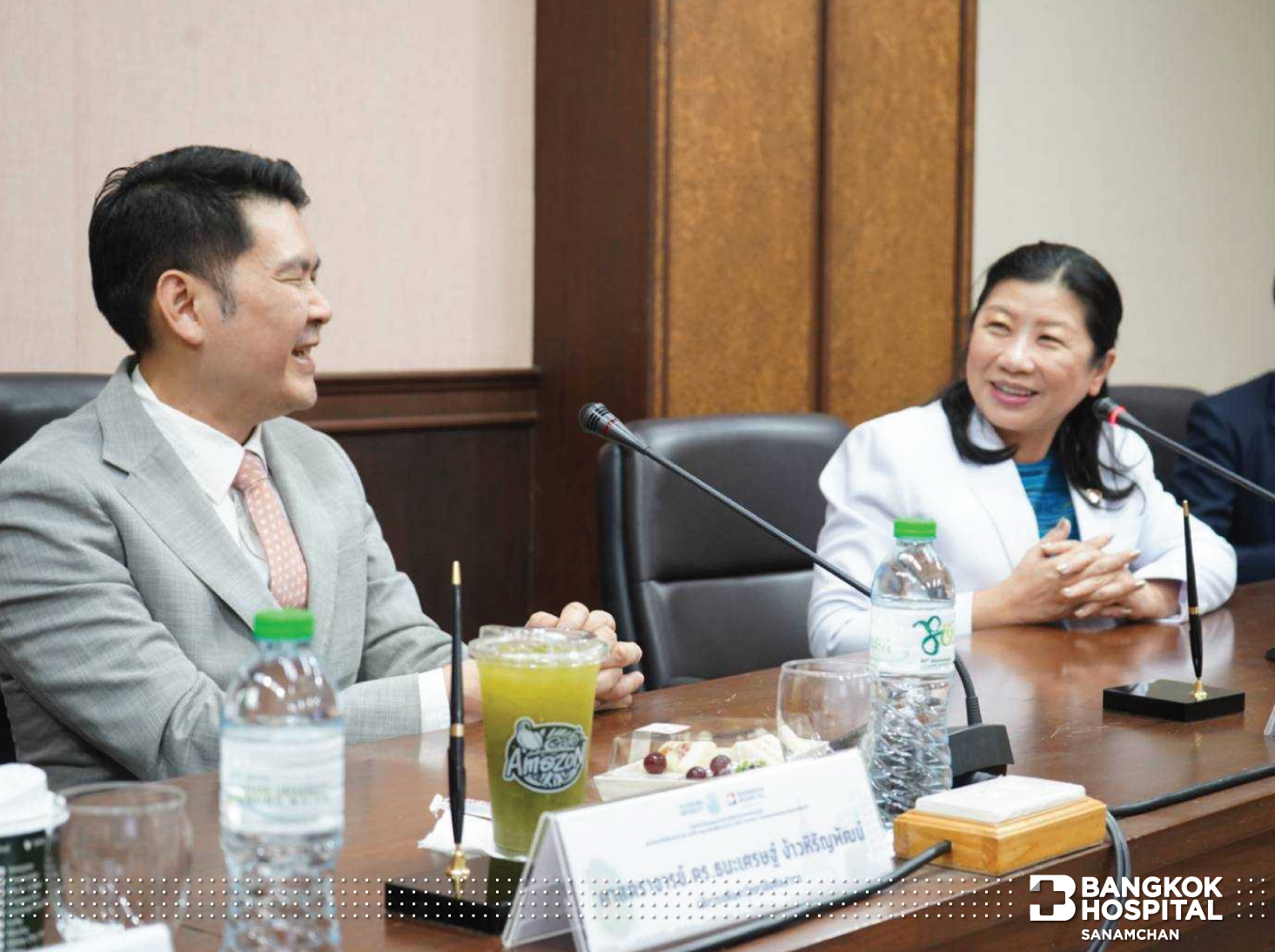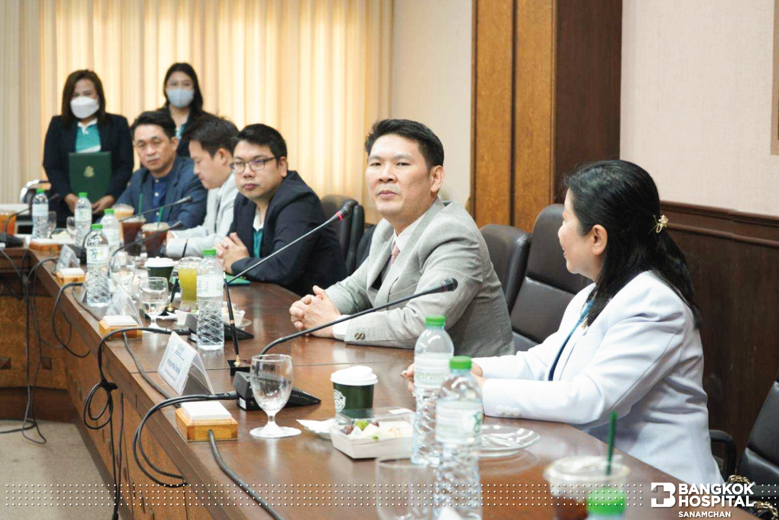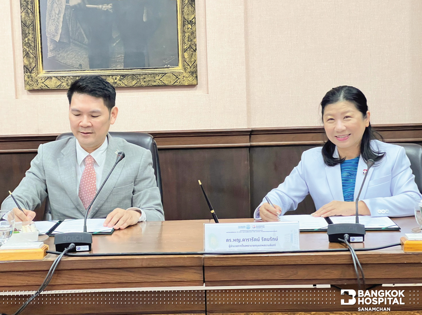ทางด้าน ดร.พญ.ดารารัตน์ รัตนรักษ์ ผู้อำนวยการโรงพยาบาลกรุงเทพสนามจันทร์ ได้กล่าวถึงการลงนามในครั้งนี้ว่า “โรงพยาบาลกรุงเทพสนามจันทร์มีความยินดีที่จะมีส่วนร่วมในการดูแลทางเรื่องสุขภาพ โดยเฉพาะในกรณีฉุกเฉิน ซึ่งนโยบายหลักของทางโรงพยาบาล คือการดูแลคนนครปฐมอย่างดีที่สุด โดยเฉพาะกรณีฉุกเฉินต้องไม่มีความกังวล เราก็นึกถึงตัวเรา ครอบครัวเรา เวลาปกติเราจะมีเวลาเลือกได้ แต่ในเวลาฉุกเฉิน เรานึกไม่ออก ให้นึกถึงโรงพยาบาลกรุงเทพสนามจันทร์ เรามีความยินดีที่จะดูแล ยินดีที่จะมารับ และพยายามดูทุกเรื่องที่จะสามารถอำนวยความสะดวกให้กับบุคลากรของมหาวิทยาลัย น้องๆนักศึกษา จะได้คลายกังวล ทางโรงพยาบาลมีศักยภาพที่จะทำได้ทุกอย่าง แม้แต่โรคที่หนักที่สุด ไม่ว่าจะเป็นโรคหัวใจ โรคหลอดเลือด โรคทางสมอง หรือโรคเด็ก ก็จะดูได้ทั้งหมด หรือถ้าต้องการความช่วยเหลือ ก็จะมีโรงพยาบาลกรุงเทพสำนักงานใหญ่ ค่อยช่วยสนับสนุนอยู่