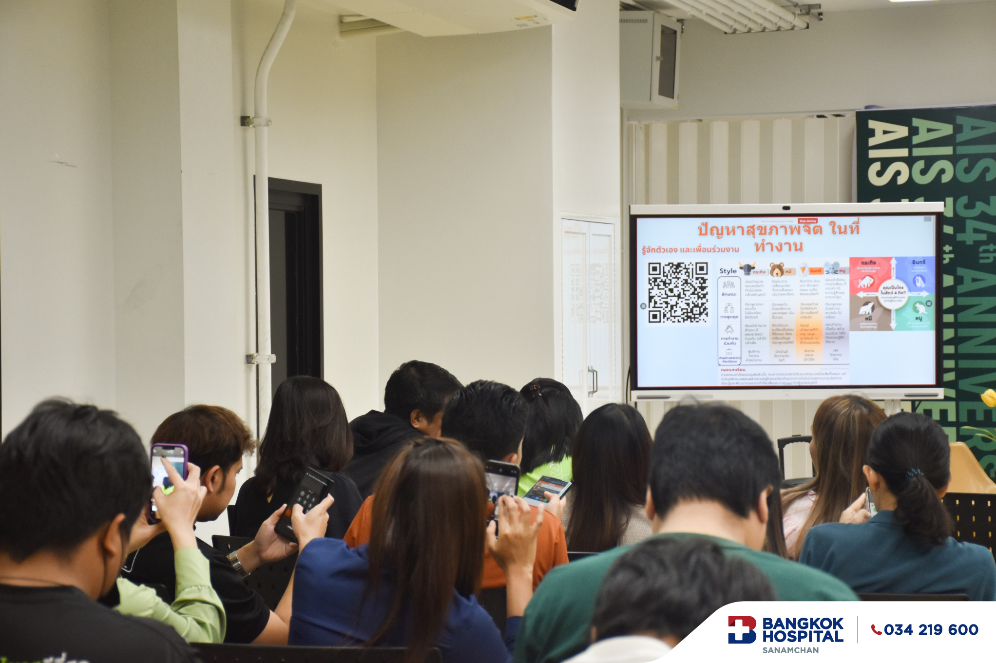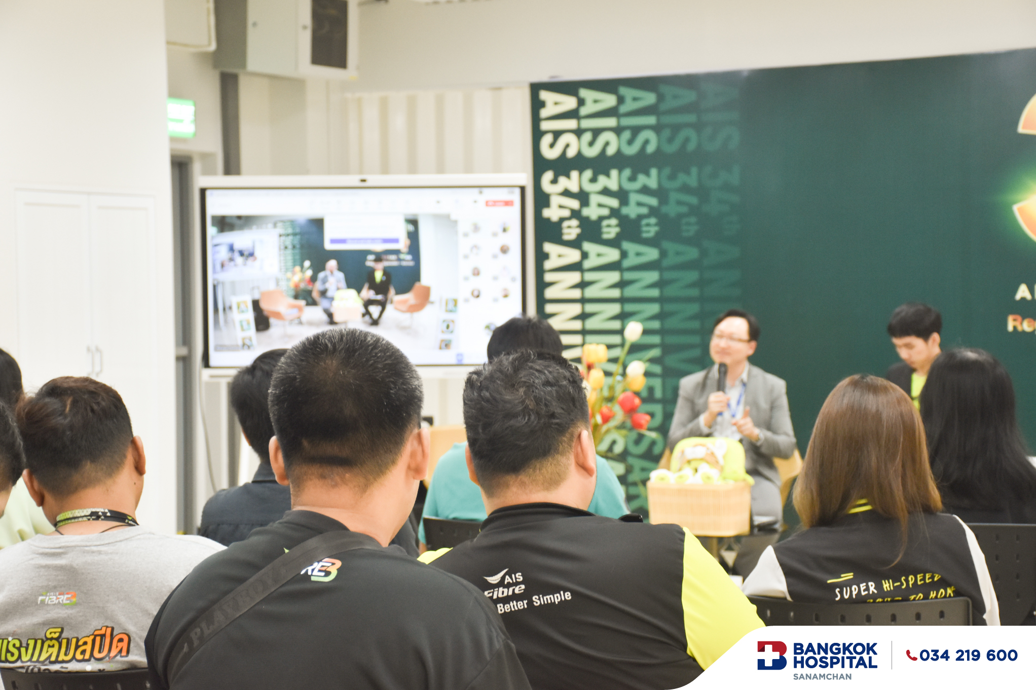 โรงพยาบาลกรุงเทพสนามจันทร์ ได้รับเชิญจาก บริษัท แอดวานซ์ ไวร์เลส เน็ทเวอร์ค จำกัด (AWN) ให้ทางโรงพยาบาลบรรยายให้ความรู้ กับ พนักงาน AIS ทั่วประเทศ โดยมีผู้เข้าอบรมทั้งแบบ on site และแบบ online ในหัวข้อ “Mental Health in Workplace” การดูแลสุขภาพจิตในที่ทำงานสำคัญอย่างไร ณ อาคารสำนักปฏิบัตการภูมิภาค-ภาคกลาง จ.นครปฐม