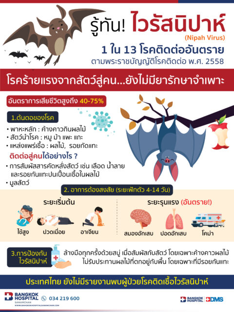 โรคติดเชื้อไวรัสนิปาห์ เป็นโรคติดต่อระหว่างสัตว์สู่คน ที่เกิดจากการสัมผัสมูลสัตว์ และสารคัดหลั่งของพาหะนำโรค ได้แก่ ค้างคาวผลไม้ หรือสุกร ม้า แมว แพะ แกะ ที่รับเชื้อมาจากค้างคาวผลไม้อีกต่อหนึ่งโรคติดเชื้อไวรัสนิปาห์ เป็นโรคติดต่อระหว่างสัตว์สู่คน ที่เกิดจากการสัมผัสมูลสัตว์ และสารคัดหลั่งของพาหะนำโรค ได้แก่ ค้างคาวผลไม้ หรือสุกร ม้า แมว แพะ แกะ ที่รับเชื้อมาจากค้างคาวผลไม้อีกต่อหนึ่งสามารถติดเชื้อจากคนสู่คนได้จากการสัมผัสสารคัดหลั่งของผู้ที่ติดเชื้อ เช่น เลือด หรือน้ำลายโรคติดเชื้อไวรัสนิปาห์ เคยแพร่ระบาดครั้งแรกในช่วงปี 2541-2542 ที่มาเลเซีย สิงคโปร์ บังกลาเทศ และอินเดีย
