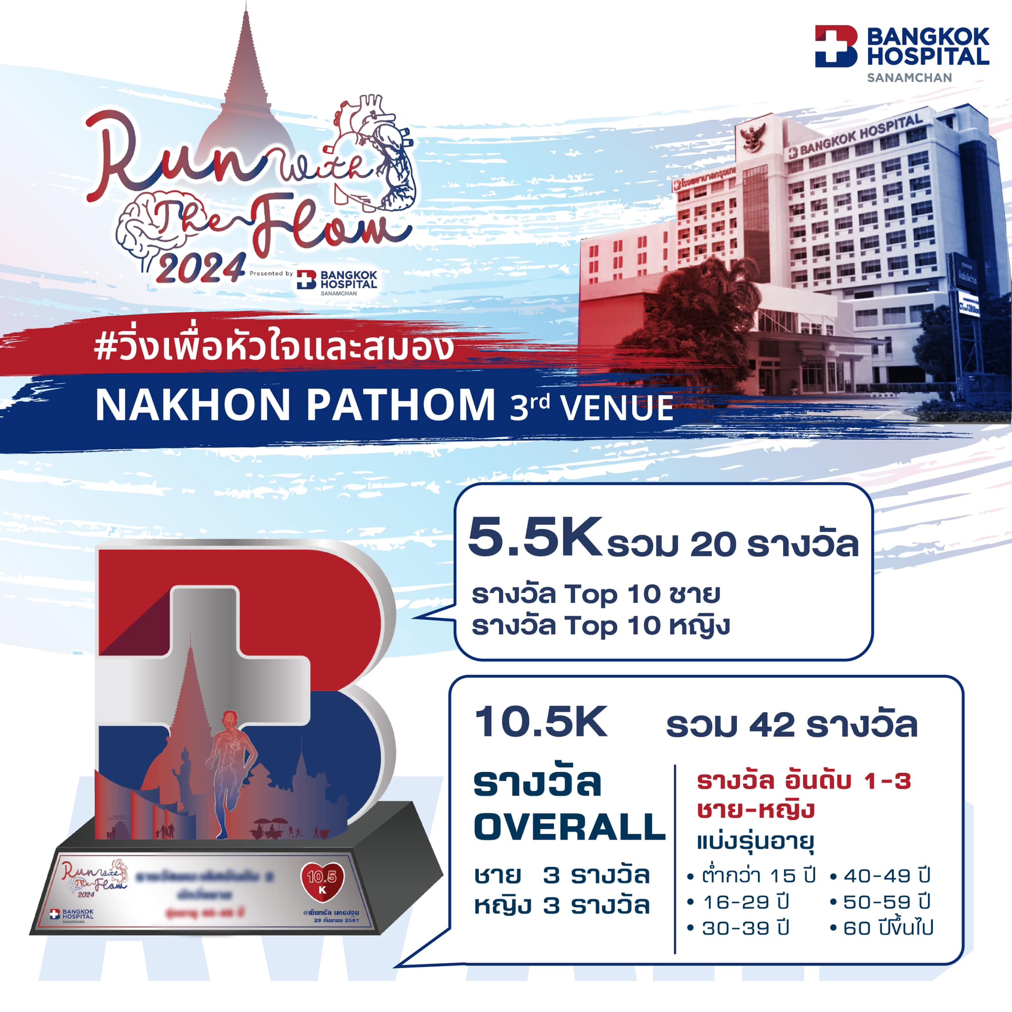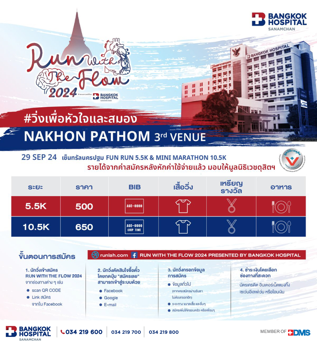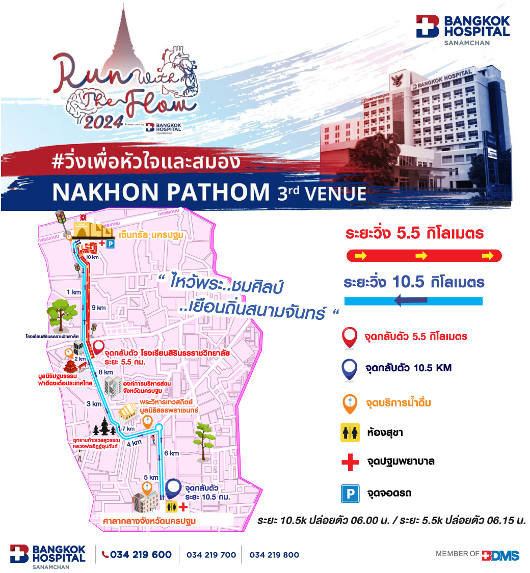 “ไหว้พระ ชมศิลป์ เยือนถิ่นสนามจันทร์” เชิญชวนร่วมกิจกรรม Run With The Flow 2024 วิ่งเพื่อหัวใจและสมอง โดยโรงพยาบาลกรุงเทพสำนักงานใหญ่ ร่วมกับโรงพยาบาลกรุงเทพกลุ่ม 1 เครือ BDMS จัดขึ้น เพื่อรณรงค์ให้ตระหนัก ตื่นตัว และดูแลสุขภาพของตนเอง เพื่อป้องกันโรคที่อาจเกิดขึ้น โดยเฉพาะโรคหลอดเลือดหัวใจ หลอดเลือดสมองและระบบประสาท