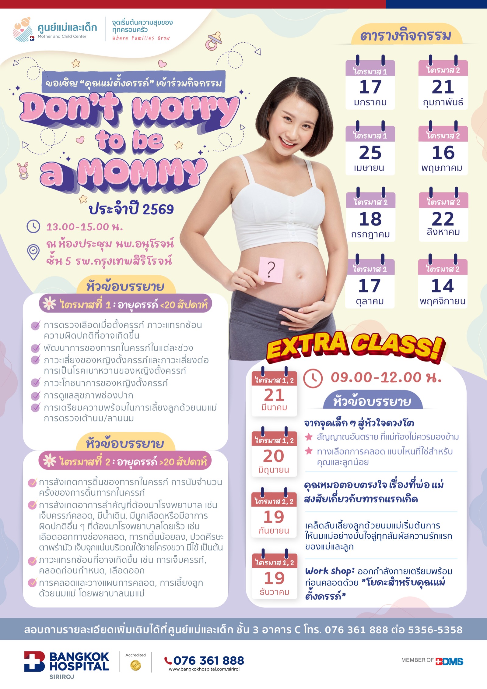 กิจกรรม Mother Class< 1 นาทีในการอ่านข้อมูลโดยโรงพยาบาลกรุงเทพสิริโรจน์อัปเดตเมื่อ: 13 มี.ค. 2569แพ็กเกจแนะนำวัคซีนป้องกันมะเร็งปากมดลูกแพ็กเกจ ตรวจสุขภาพก่อนมีบุตรแพ็กเกจฝากครรภ์ครั้งแรกโรงพยาบาลกรุงเทพสิริโรจน์อัปเดตเมื่อ: 13 มี.ค. 2569สอบถามเพิ่มเติมที่คลินิกสูติ-นรีเวช และศูนย์การแพทย์เพื่อการมีบุตรชั้น 3 อาคาร 5เปิดให้บริการทุกวัน ตั้งแต่เวลา 08.00 น. – 16.00 น. 076-361-888 ต่อ 5356, 5357[email protected]@sirirojhospitalแพ็กเกจและโปรโมชั่นวัคซีนป้องกันมะเร็งปากมดลูก8,900 - 21,000 บาทรายละเอียดแพ็กเกจ ตรวจสุขภาพก่อนมีบุตร3,200 บาทรายละเอียดแพ็กเกจฝากครรภ์ครั้งแรก4,200 บาทรายละเอียดดูแพ็กเกจอื่น ๆ