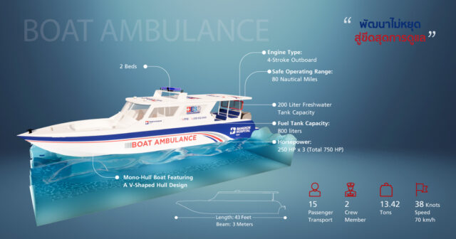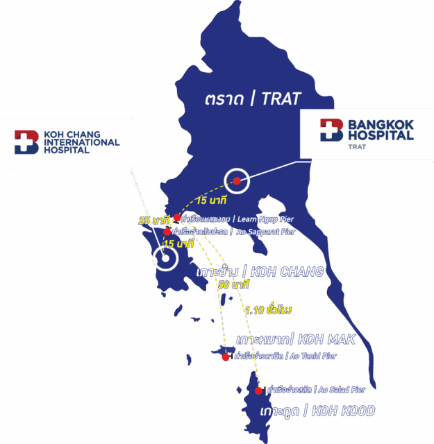 ให้บริการรับ-ส่งผู้ป่วยจากเกาะกูด เกาะหมาก และเกาะช้าง ครอบคลุมผู้ป่วยทั่วไป ผู้ป่วยฉุกเฉิน และผู้ป่วยวิกฤตตลอด 24 ชั่วโมง ด้วยความมุ่งมั่นในการช่วยเหลือผู้ป่วยให้ได้รับการดูแลรักษาอย่างทันท่วงที โดยทีมแพทย์ พยาบาล และบุคลากรทางการแพทย์ที่มีความเชี่ยวชาญ พร้อมอุปกรณ์ช่วยชีวิตที่ได้มาตรฐานภายในเรือ ซึ่งถูกออกแบบมาโดยเฉพาะให้สามารถปฏิบัติงานในพื้นที่ทางทะเลได้อย่างมีประสิทธิภาพ รองรับการเดินทางระยะไกลได้สูงสุดถึง 80 ไมล์ทะเล ด้วยความเร็วและความปลอดภัยสูง เพื่อส่งต่อผู้ป่วยเข้าสู่ระบบการรักษาของโรงพยาบาลหลักได้อย่างรวดเร็วและปลอดภัย