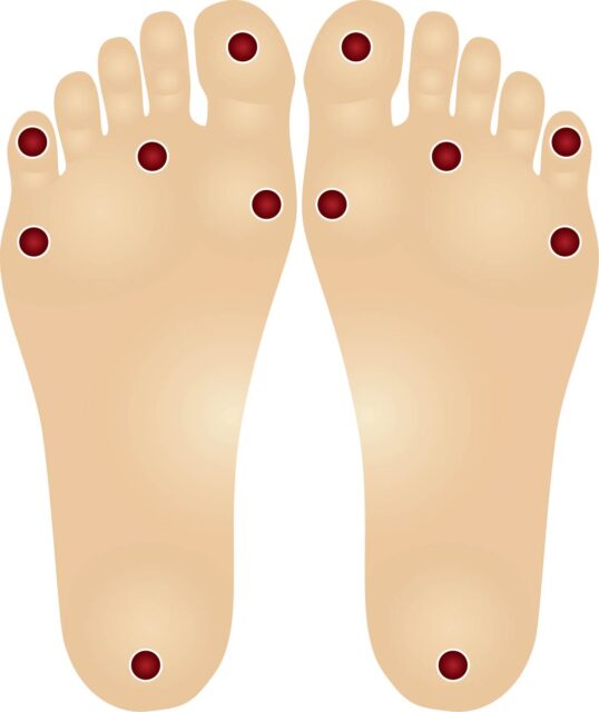 - ผิวหนังหนา / ตาปลา / รอยแตก: บริเวณที่หนาผิดปกติอาจทำให้การรับความรู้สึกลดลงหรือเกิดแผลจากการเสียดสี