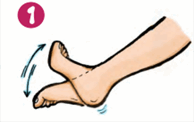 กระดกข้อเท้าขึ้น ค้าง 5 วินาที → กระดกลง ค้าง 5 วินาที ทำสลับช้า ๆ จำนวน 20 ครั้ง (เช้า – กลางวัน – เย็น)