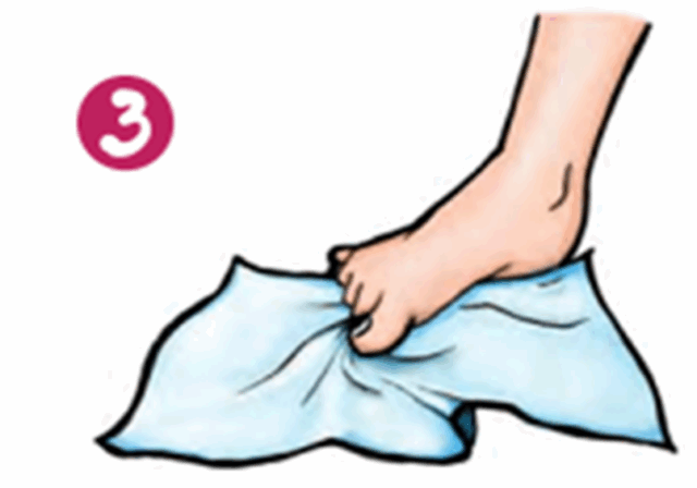 วางผ้าบนพื้น ใช้นิ้วเท้าจิกผ้า ค้าง 5 วินาที ทำ 20 ครั้ง (เช้า – กลางวัน – เย็น) เพื่อฝึกกล้ามเนื้อเล็ก ๆ ในฝ่าเท้า