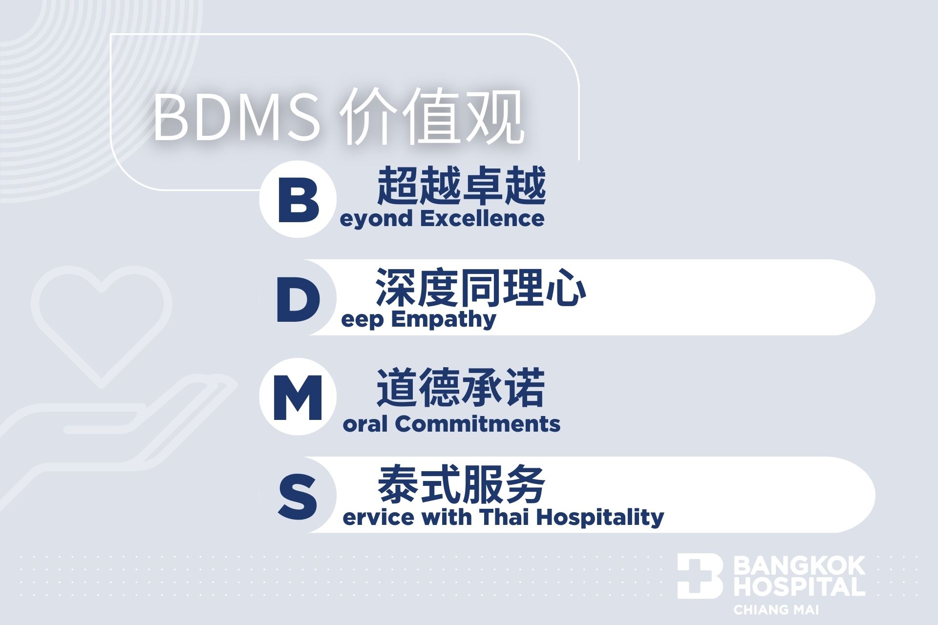 “对于我来说,在治疗患者时,无论地点在哪里,我们都希望得到最好的结果。这对于患者和家人来说也是一样的。因此,BDMS 价值观核心是患者护理,因为每个 B、D、M、S 都突出了我们的重要作用。每个价值必须要转化为患者可触及的,这是团队中每个人都要参与设计的东西。