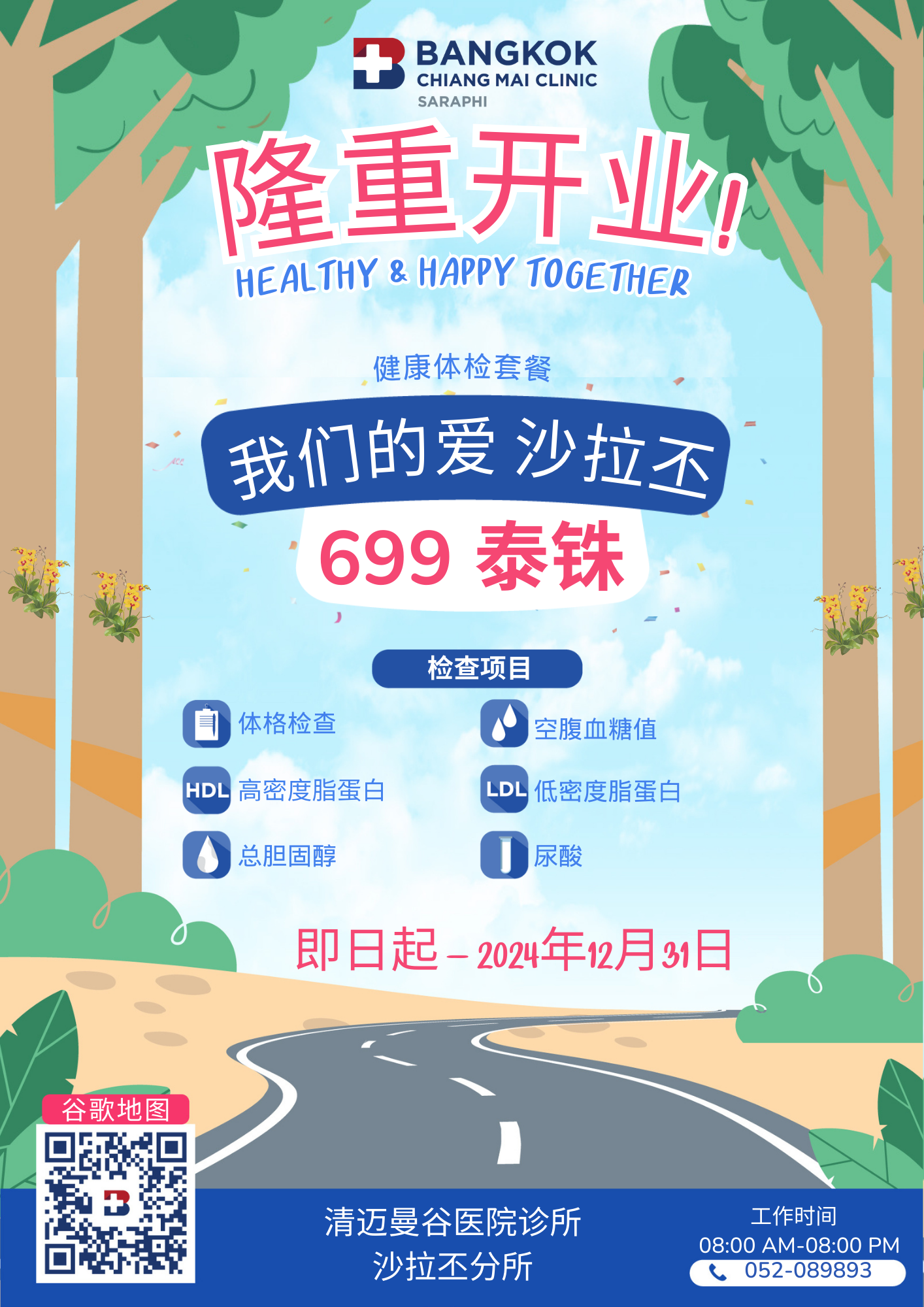 该套餐提供价值699泰铢的健康检查项目,邀请沙拉丕居民进行全面的健康检查,包括检查血糖、胆固醇和尿酸水平。该套餐有效期即日起至2024年12月31日。