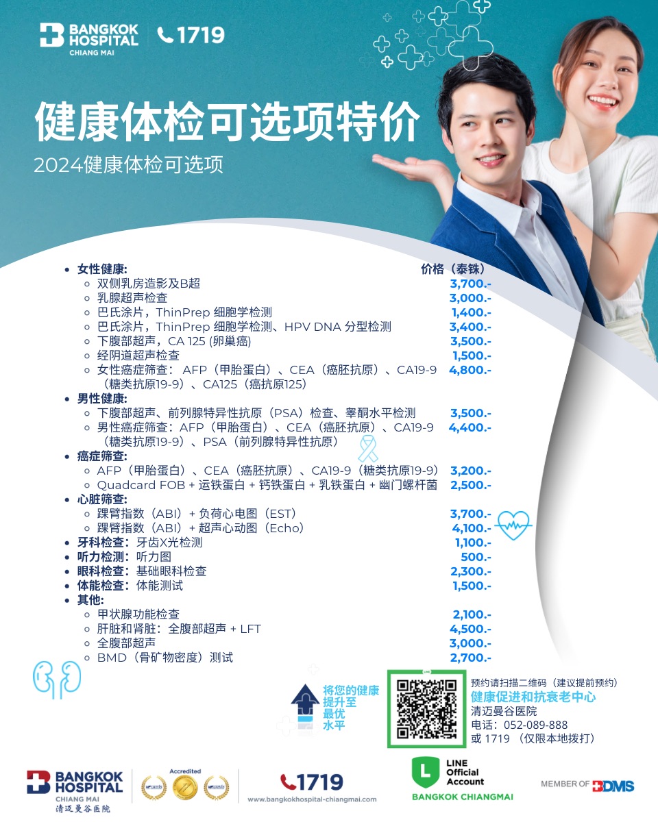 - 男性癌症筛查:AFP(甲胎蛋白)、CEA(癌胚抗原)、CA19-9(糖类抗原19-9)、PSA(前列特异性抗): 4,400 THB