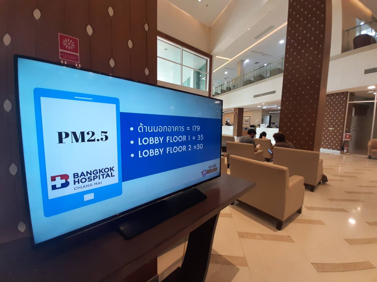 在清迈曼谷医院,我们使用空气探测器监测,记录并公告医院内每个区域的PM2.5水平:住院病房,大厅和走廊,六个卓越中心(心脏中心、神经中心、骨科中心、肿瘤中心、创伤急救中心以及儿科中心)和各就诊科室。 每日报告将在1楼大厅的屏幕上显示。