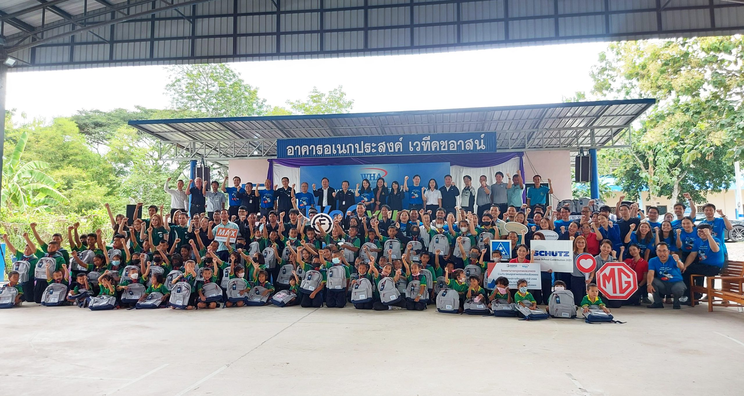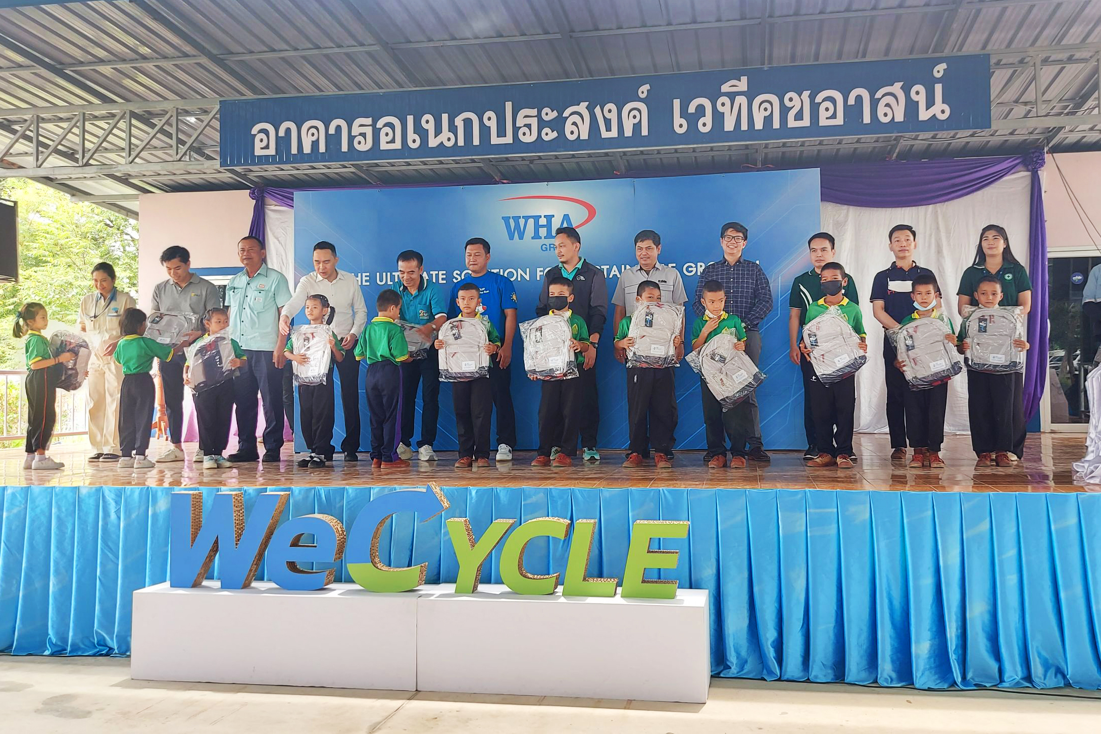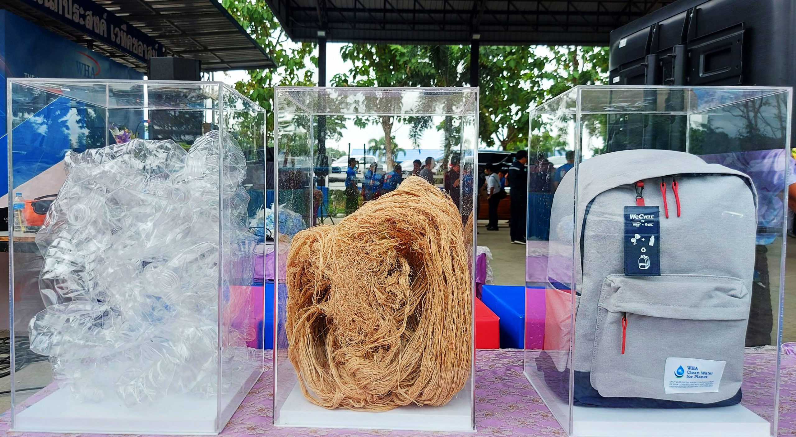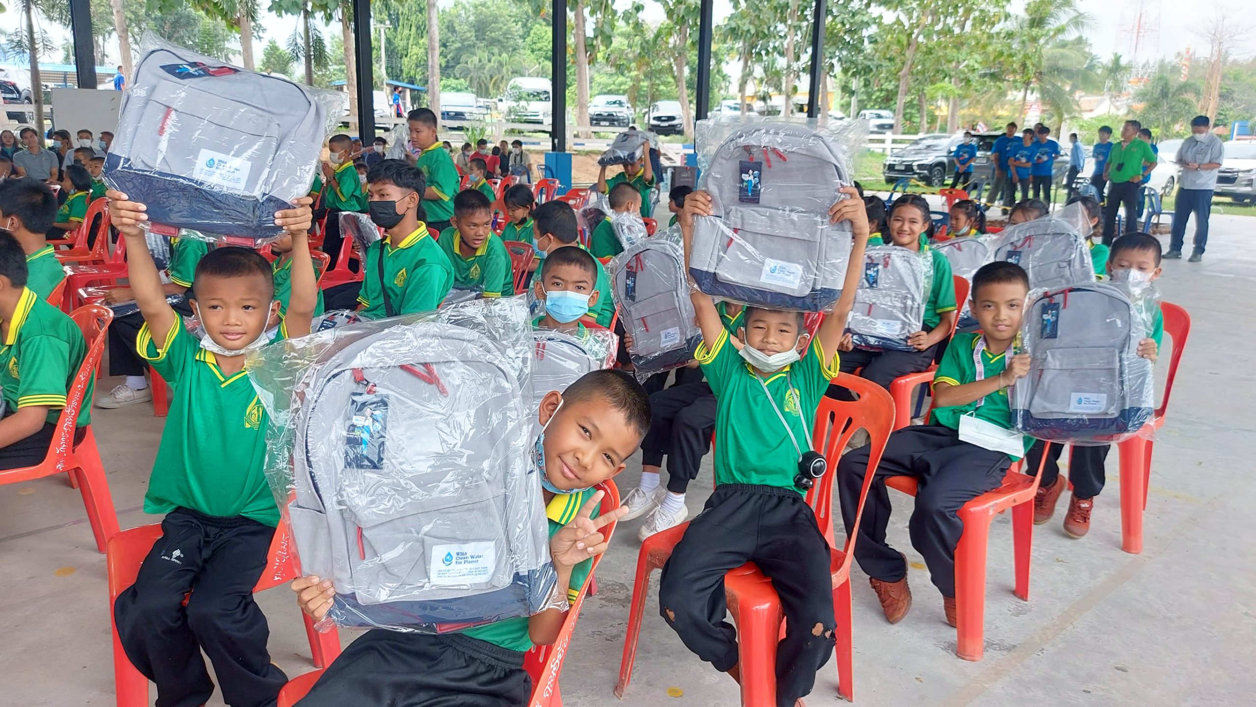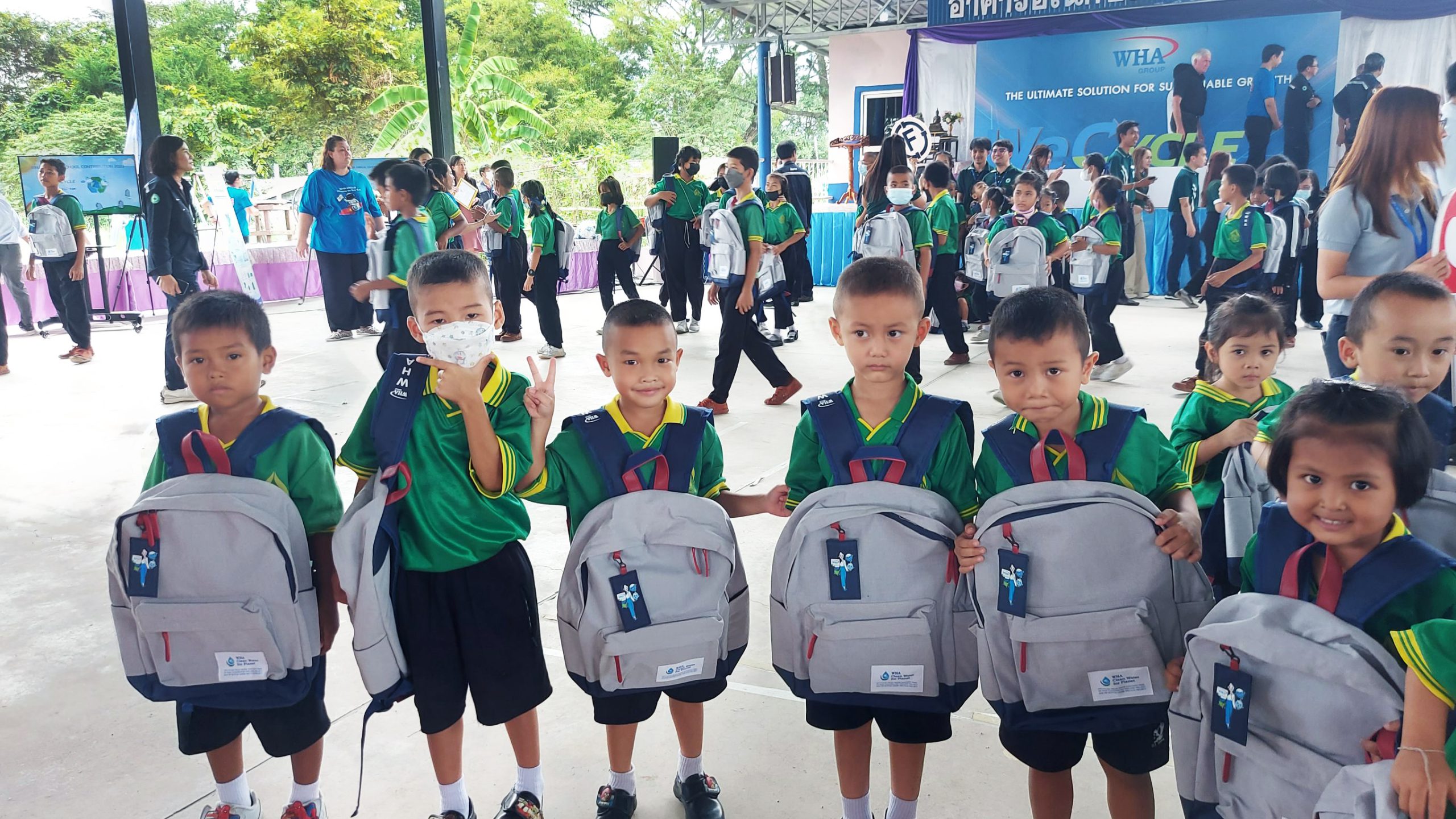 并携手合作伙伴企业,向 班农素象学校(Ban Nong Suea Chang School) 的学生捐赠了由回收 PET 塑料瓶再生(Upcycle)并结合水葫芦纤维制成的学生书包。