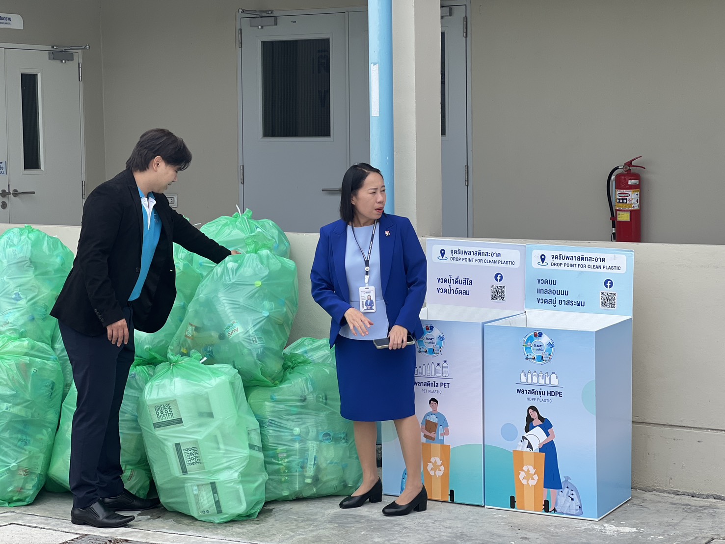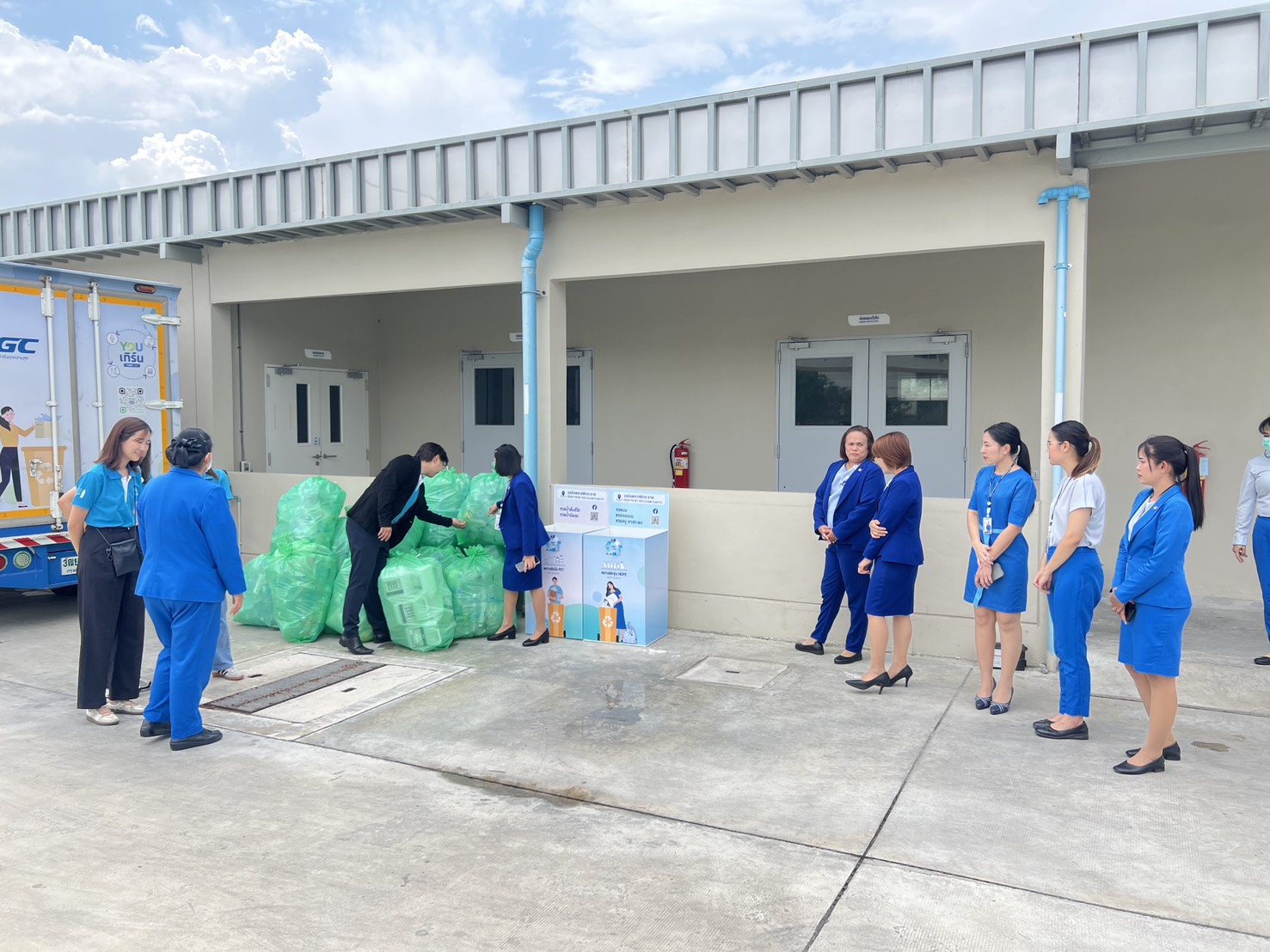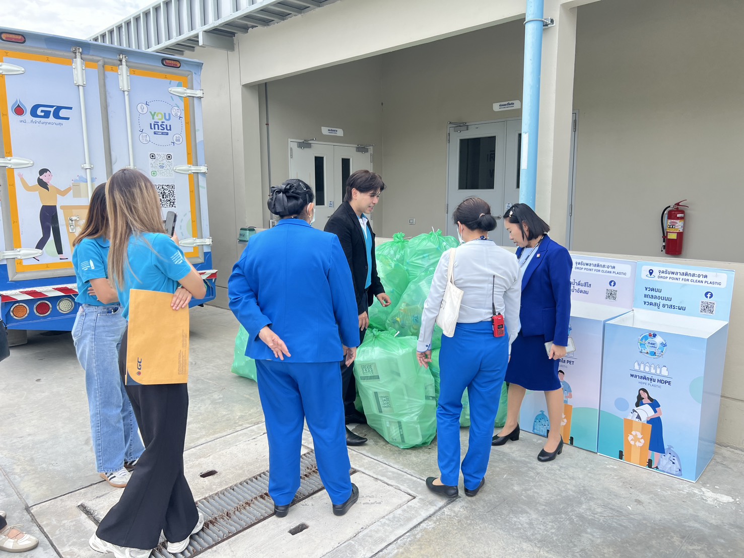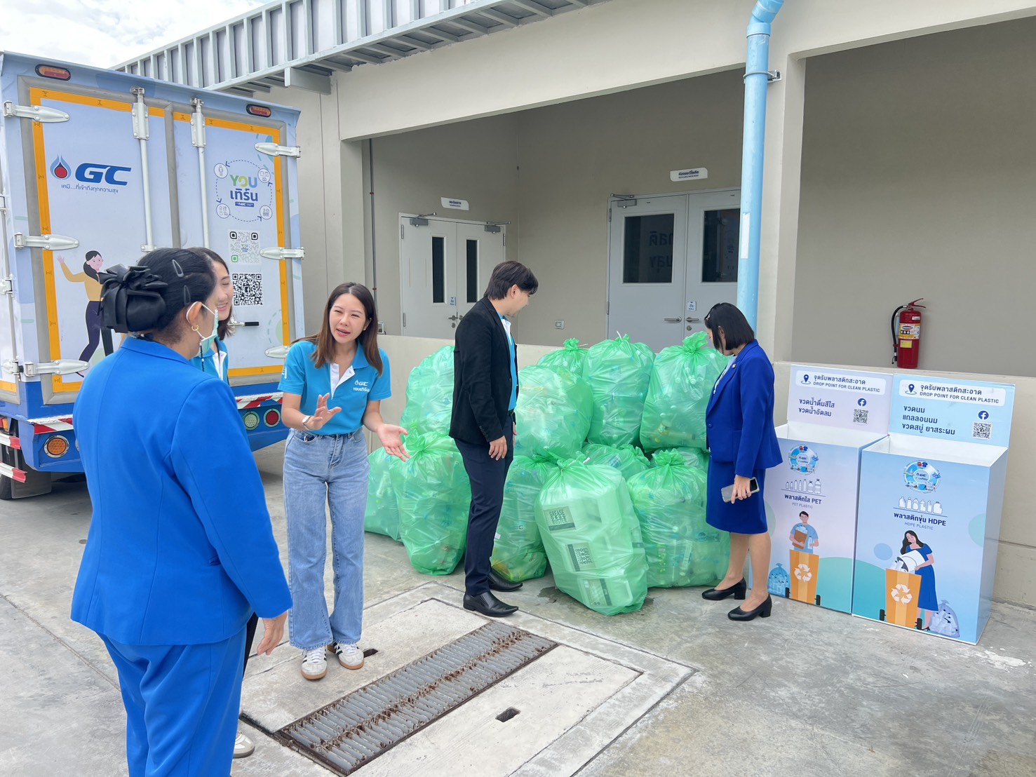Patcharee Piyaworadej 医生,曼谷普罗登医院院长,代表医院向 GC YOU Turn 循环经济项目经理 Pakpoom Pitakthanangkoon 先生 及其团队,移交医院内塑料回收投放点(Drop Point)所收集的透明 PET 塑料瓶及不透明 HDPE 塑料瓶。